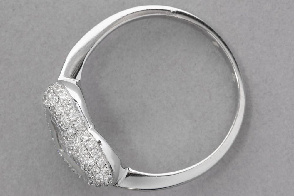Moderne ring in witgoud (18 karaat) met een hartvormig sierstuk bezet met briljant in carréslijp, omringd door briljant in klassieke slijp – in totaal : ca 1 karaat witte (H/I) kwaliteitsbriljant (Vs/Si)