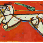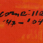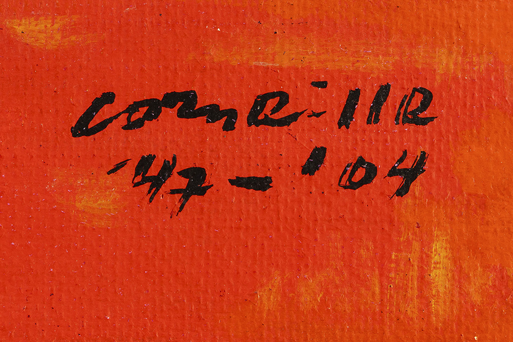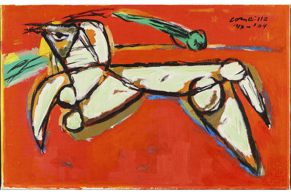 CORNEILLE (1922 – 2010) acrylverfschilderij op doek met een abstracte compositie met figuur, gebaseerd op een werk uit 1947 – 39 x 60 getekend en gedateerd ’47 – ’04 geëxposeerd in het Liu Haisu Art Museum, Shangai, 2004