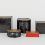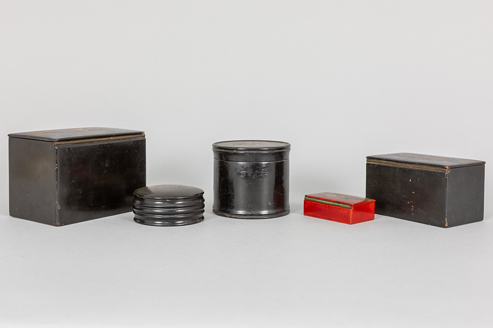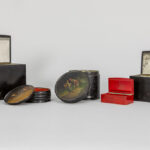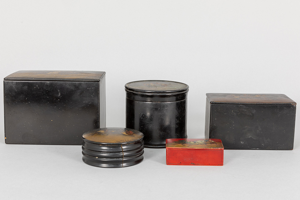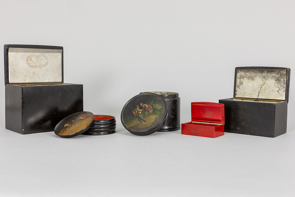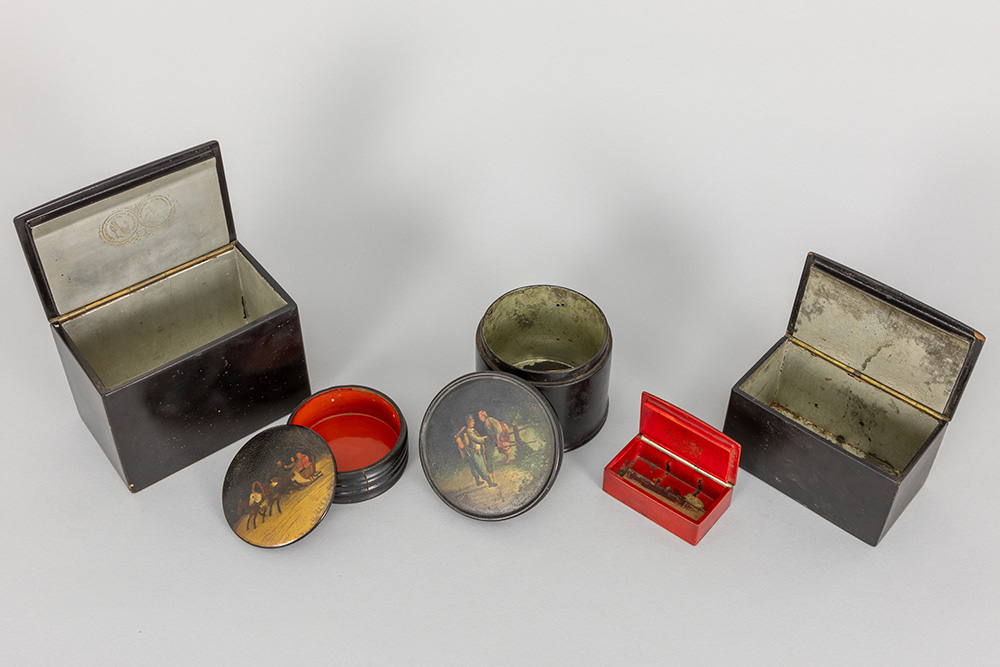 Lot van vijf antieke Russische ‘Palekh’-doosjes met geëmailleerd deksel (met allerlei decors) en met telkens aan de binnenkant een merk met profiel van Tsaar Alexander III gedateerd 1882 – hoogtes van 2,5 tot 11 cm