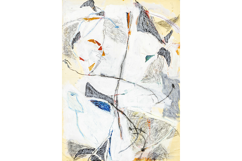 NEYT PARCIFAL (° Gent 1960) werk in gemengde techniek met collage op doek : “Compositie” – 74 x 54 gemonogrammeerd