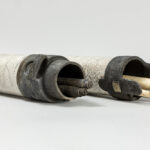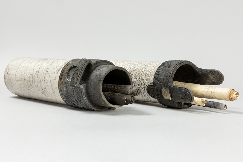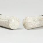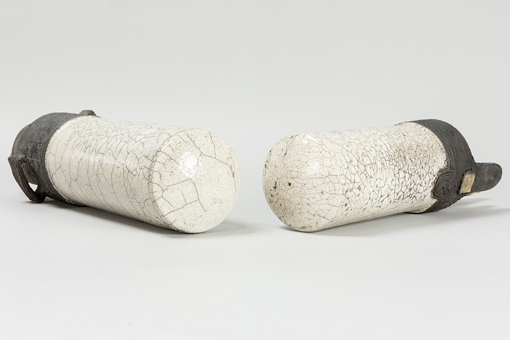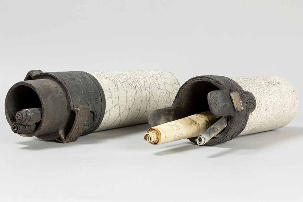 Dubbele, allicht Belgische assemblagesculptuur in keramiek en beschreven oud papier – breedtes : ca 37 en 46 prov : Luc Jonckers