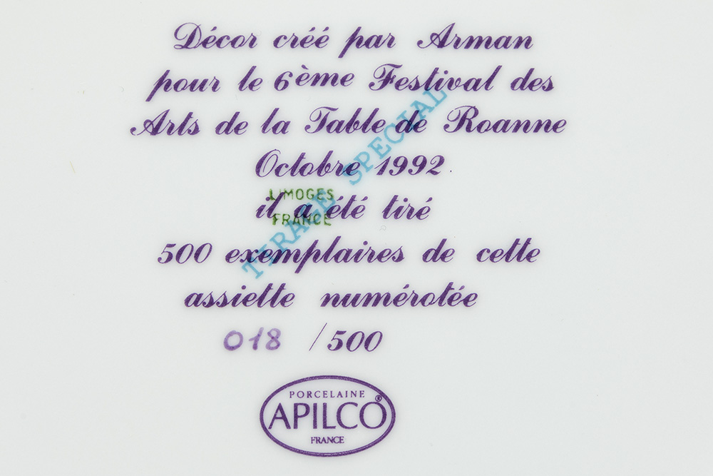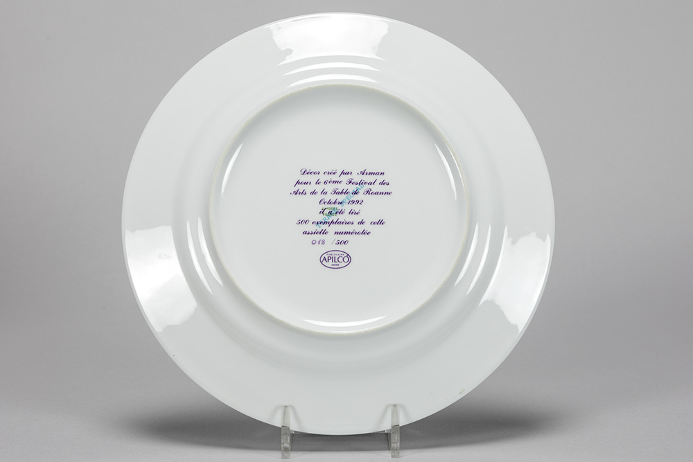 ARMAN (1928 – 2005) schaal n° 234/500 in porselein van Limoges uitgegeven ter ere van het Zesde “Festival des Arts de la Table Roanne” (oktober 1992) – diameter : 27 cm