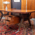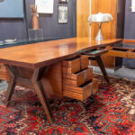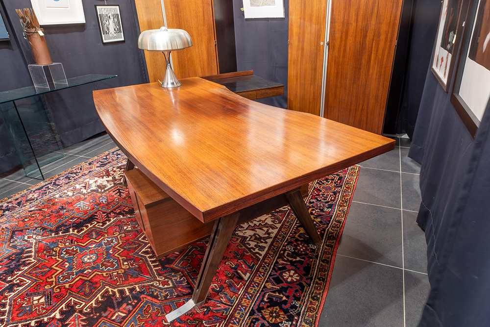ICO PARISI (1916 – 1996) mooi design bureau in palissander met model “Terni” (dd 1958) voor ‘Mim Roma’ – 72,5 x 210 x 150 cm gemerkt Het standard Terni bureau werd geleverd met een rechthoekig tafelblad, maar de versie met gebogen profile, zoals deze, was alleen op speciale bestelling verkrijgbaar. Het standard Terni bureau werd geleverd met een rechthoekig tafelblad, maar de versie met gebogen profile, zoals deze, was alleen op speciale bestelling verkrijgbaar.