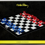 HARING KEITH (1958 – 1990) zeldzaam collector’s item : “Keith Haring Chess” – ca 46 x 46 cm de schaakstukken zijn gemaakt uit acryl en gebaseerd op iconische werken van Haring, telkens tussen de 2,5 en 4 cm Licensed by ArtMerchandising & Media AG, The Estate of Keith Haring