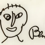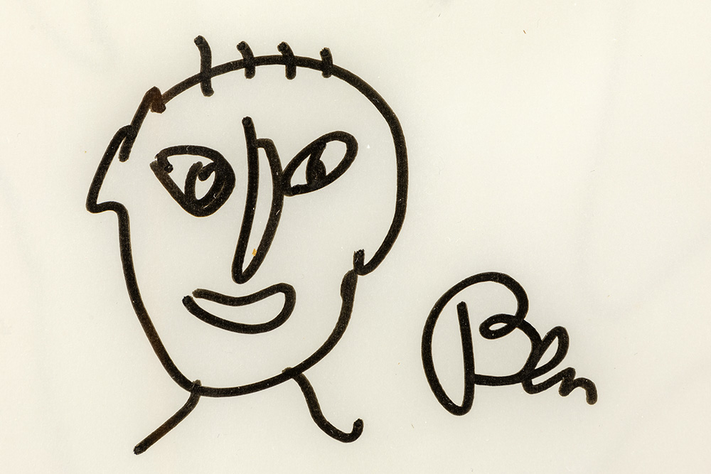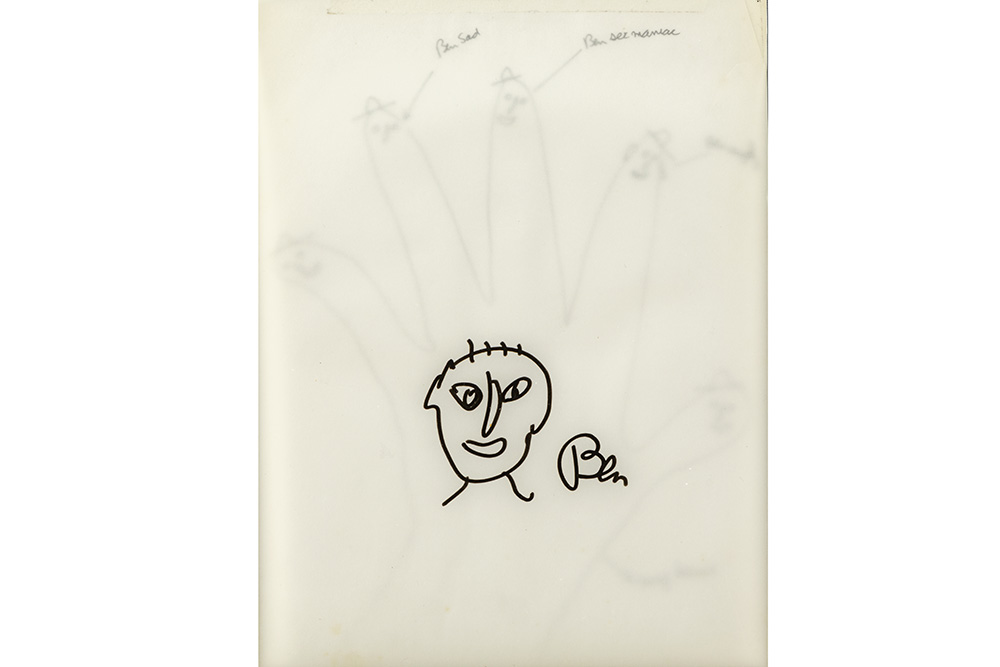 Ben Vautier signed drawing on chalk paper on another drawing of his hand & with annotations on the paper below