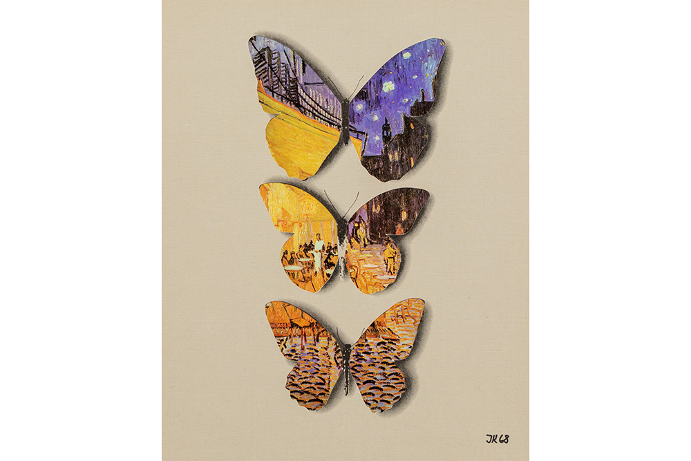 Jiri Kollar monogrammed original work with a collage of butterfly prints based on the work “Terrasse du café le soir” dd 1888 by Van Gogh