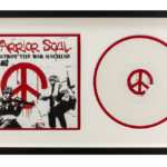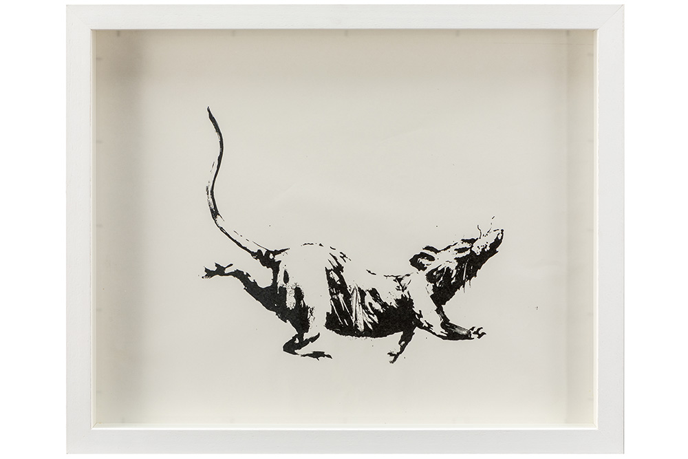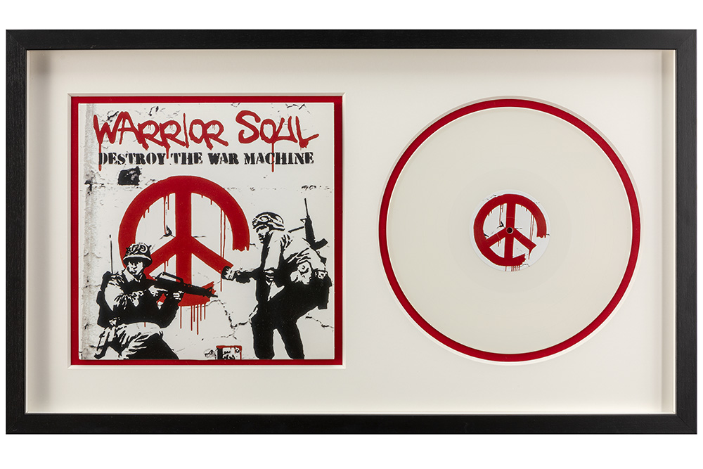 BANKSY (° 1974) set (2) ingekaderde items : – zeldzame genummerde limited edition vinyl “Warrior Soul – Destroy the War Machine” uit 2016 met hoes ontworpen door Banksy, uitgegeven in een oplage van 333 – originele “Rat”-print op speciaal dun papier, waardoor de print deels doordrukt en uniek is – 39 x 49 deze print is gemaakt ter gelegenheid van een tweedaagse pop-up shop van Banksy in Londen (in de wijk Croydon) in 2019, met de naam “Gross Domestic Product – The Homewares Brand from Banksy”
