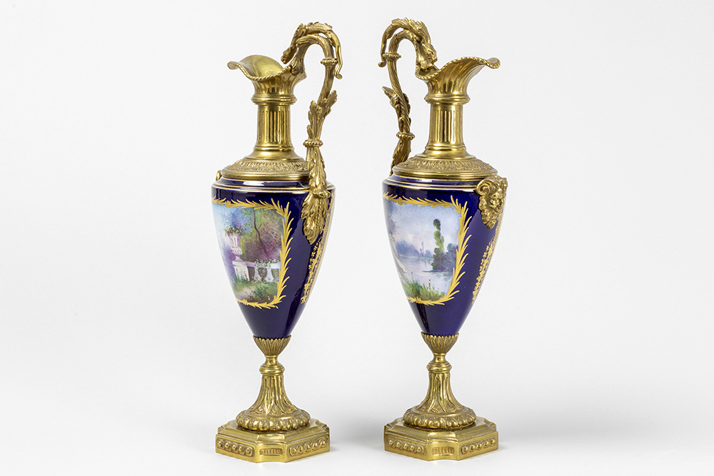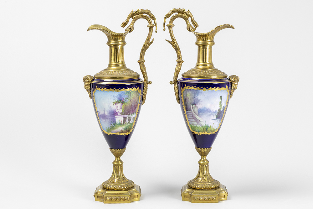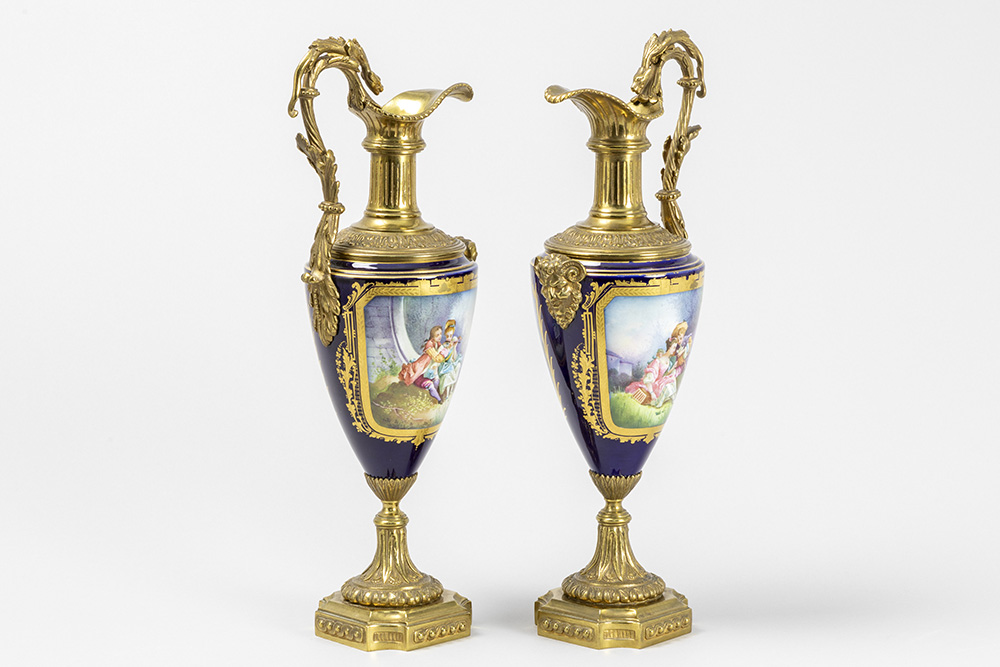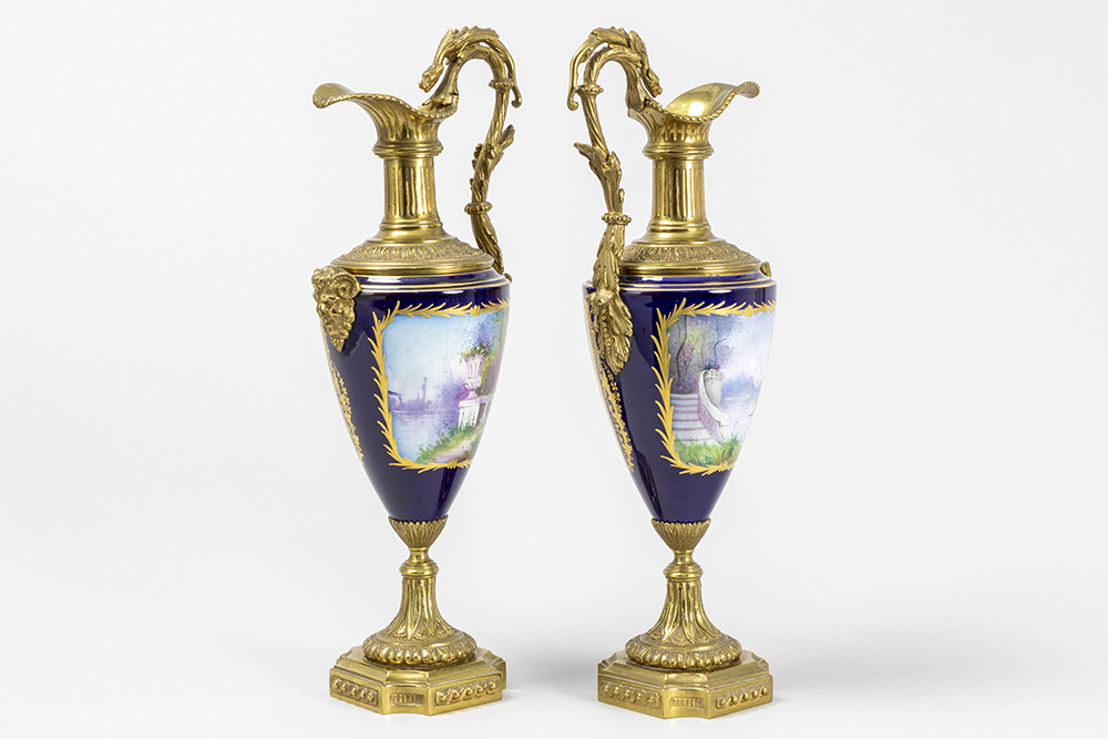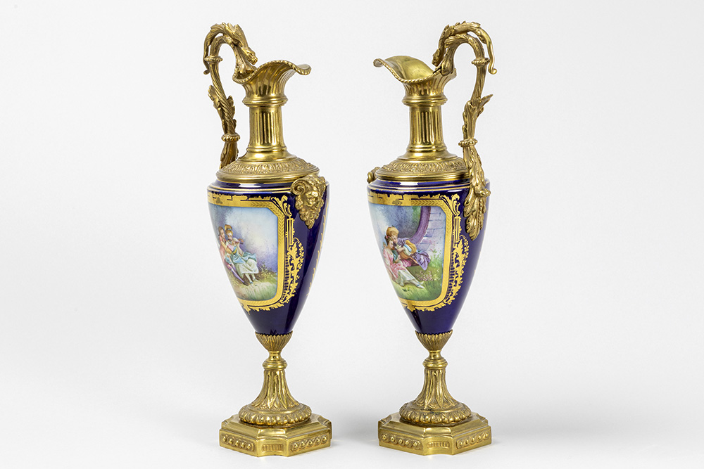 pair of antique neoclassical ornamental pitchers in bronze and Sèvres porcelain