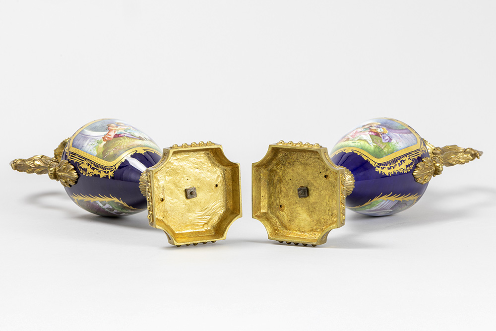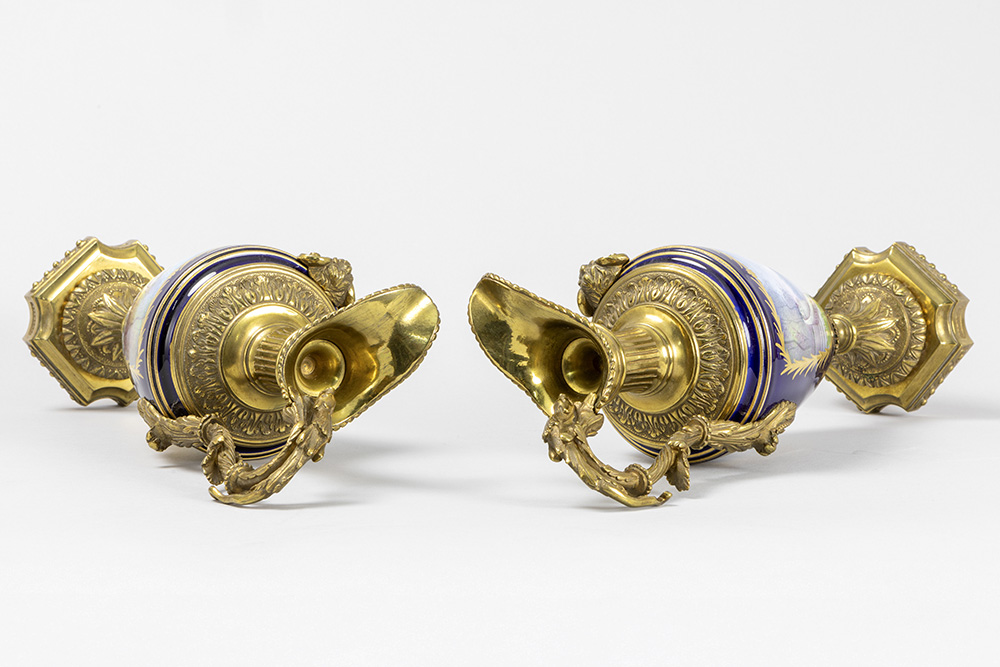 Paar antieke neoclassicistische sierkruiken in brons en Sèvres-porselein met beschilderde decors – hoogte : 40,5 cm