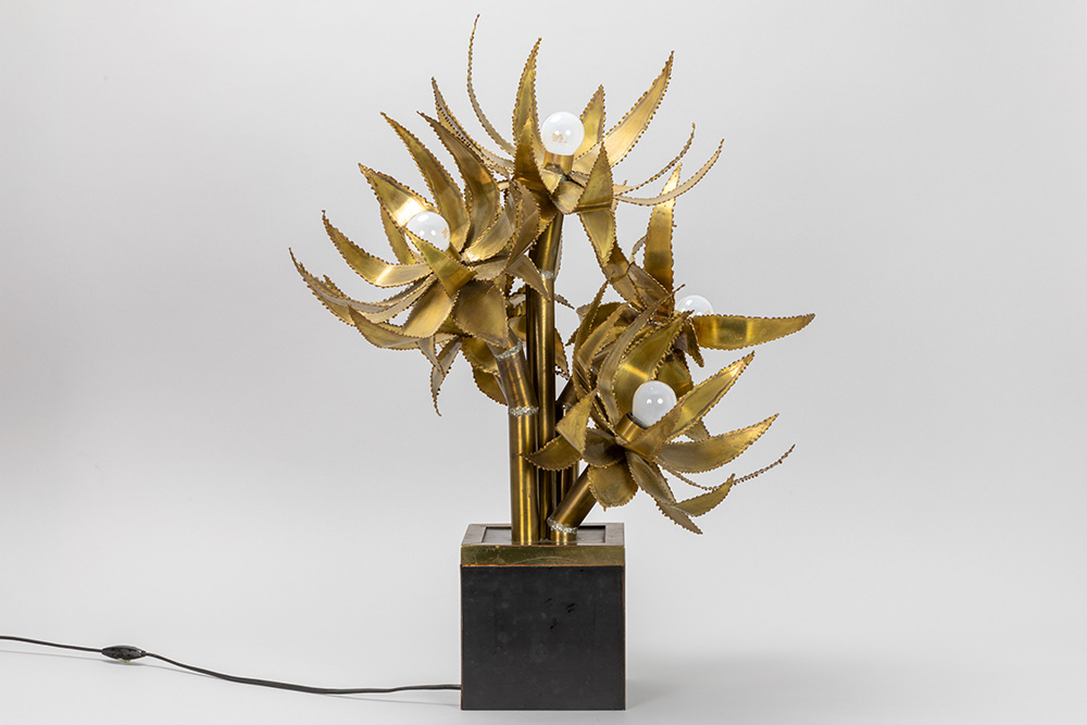 MAISON JANSEN – toegeschreven aan / OMGEVING VAN decoratieve eighties/nineties’ lamp in “Hollywood Regency”-stijl in de vorm van een bloementuil in koper – op voet in hout – hoogte : ca 70 cm