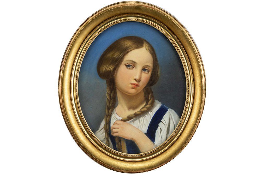 Antieke ovale pastel : “Jong meisje met vlechten” – 45 x 36,5
