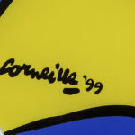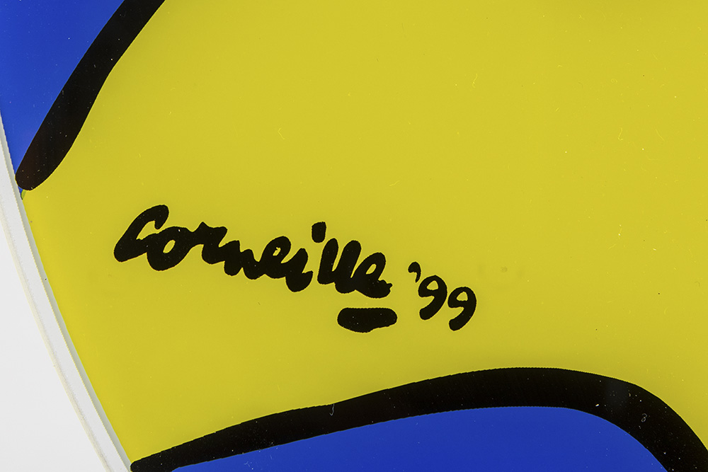 CORNEILLE (1922 – 2010) wandklok in glas met print – diameter : 35 cm in de plaat getekend en gedateerd (19)99