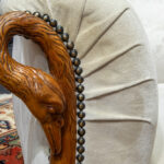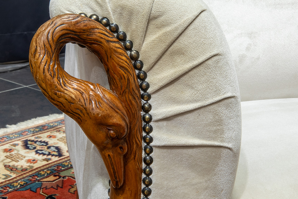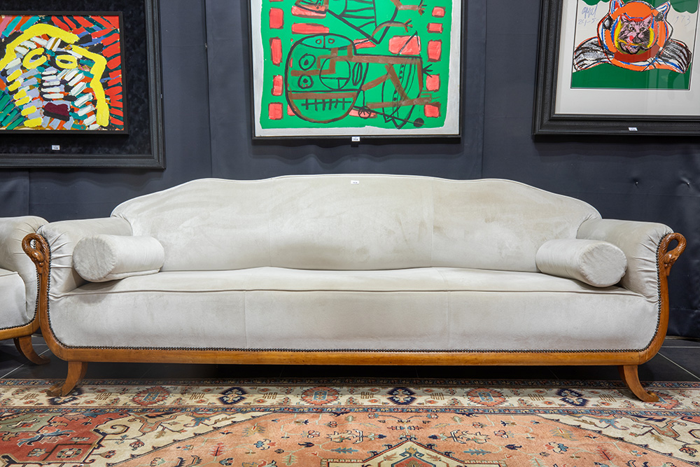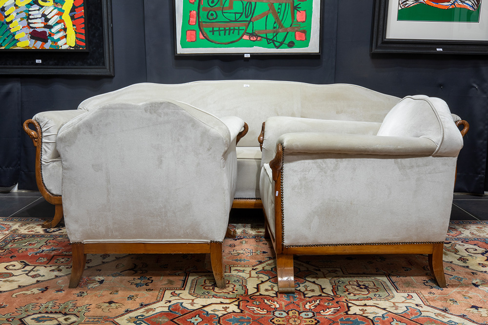 Mooi driedelig Art Deco-salonensemble in kerselaar telkens met fijngesculpteerde zwanenhalzen : grote sofa (86 x 260 x 88 cm)en twee ruime één-zitten (81 x 89 x 75 cm)  –  ca 1920/30