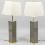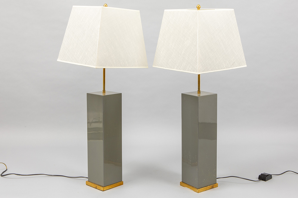Paar nineties’ design lampen met grijsgelakte voet en originele kap – totale hoogte : 100 cm
