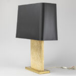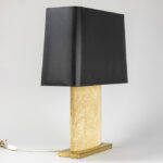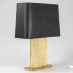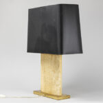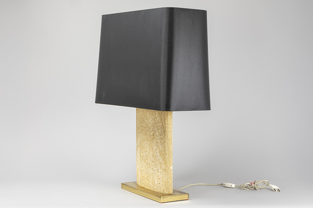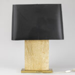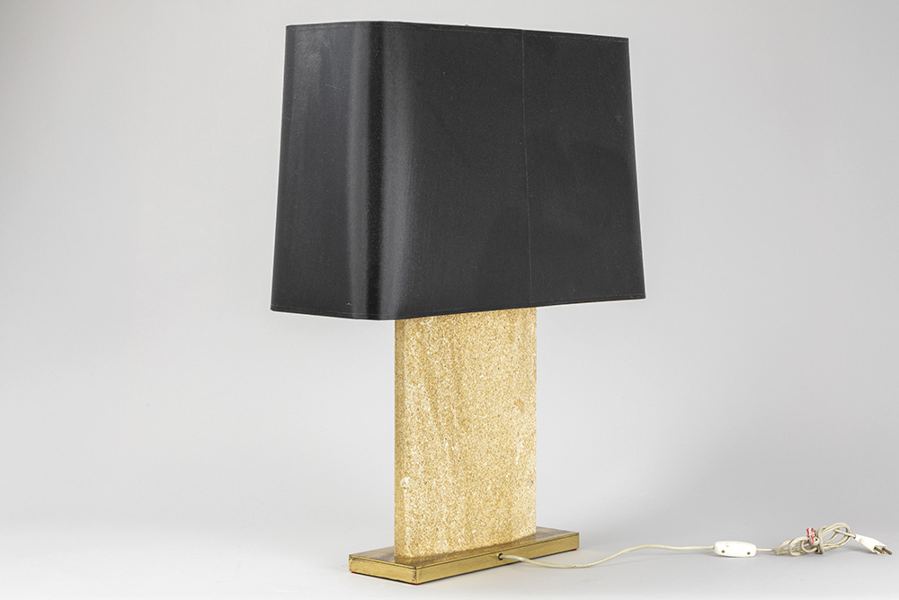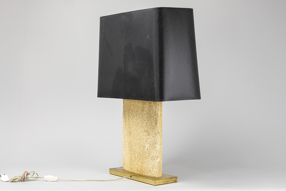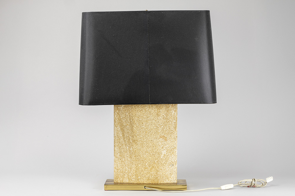 Nineties’ designlamp met voet in witsteen op een basis in messing – hoogte : ca 37 cm – met kap