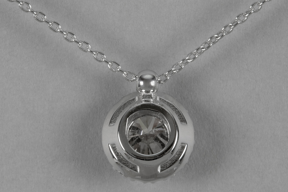 round pendant in white gold (18 carat) with a central 1,34 carat quality brilliant cut diamond surrounded by 0,20 carat of high quality brilliant cut diamonds – with a chain in white gold (18 carat)