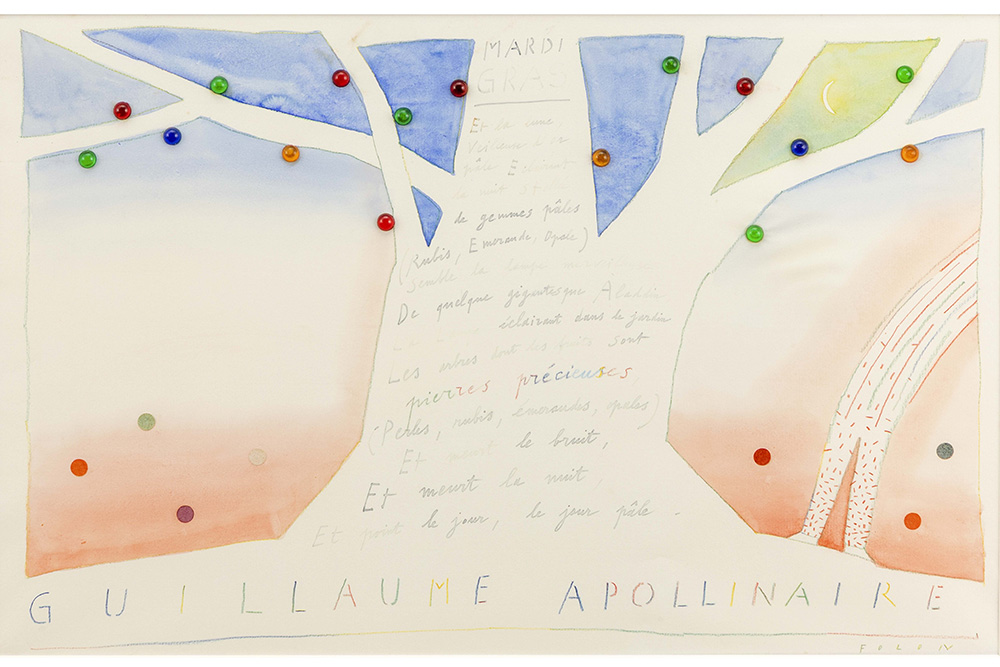 Jean-Michel Folon signed mixed media with watercolor and collage with a characteristic poetic surrealist style theme titled “Mardi-Gras” – dated 1983 and with a dedication