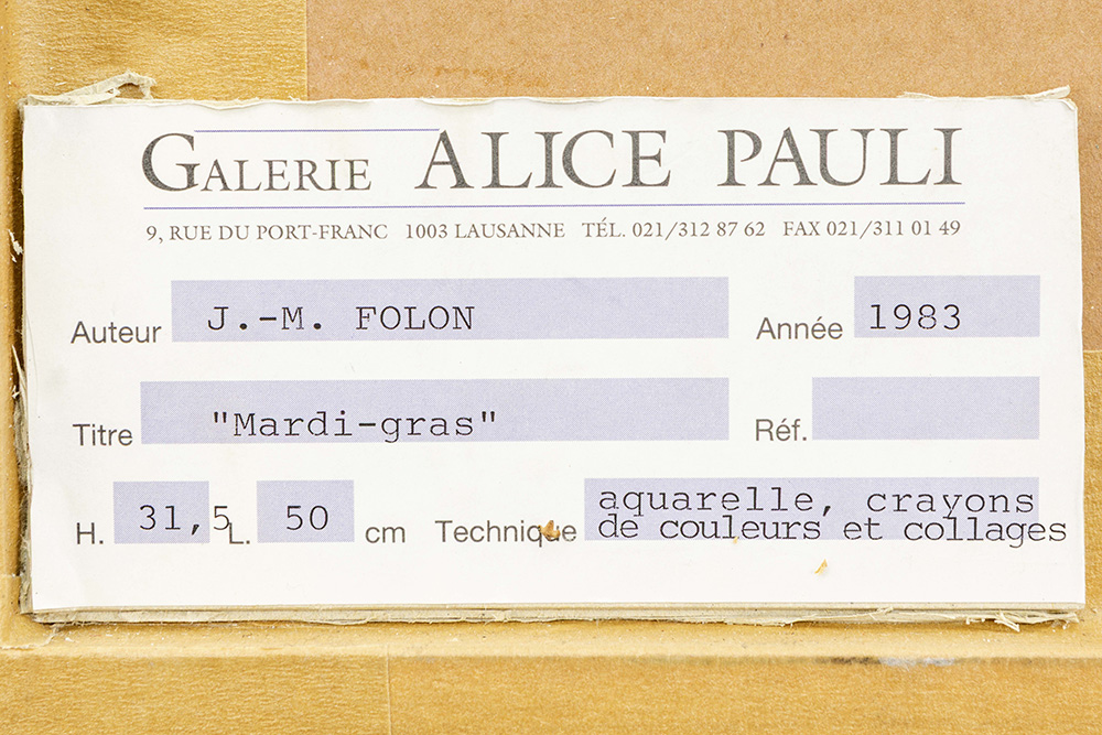 FOLON JEAN-MICHEL (1934 – 2005) JEAN-MICHEL (1934 – 2005) werk in gemengde techniek met aquarel en collage met een karakteristiek uitgewerkt poëtisch-surrealistisch thema, getiteld : “Mardi-Gras” – 31,5 x 50 getekend, gedateerd 1983 en gededicaceerd