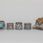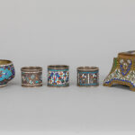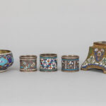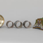 Lot (5) van antiek Russisch zilver met een kovsh, servietteringen en een inktpot in deels geëmailleerd zilver – gewicht : 390 gram