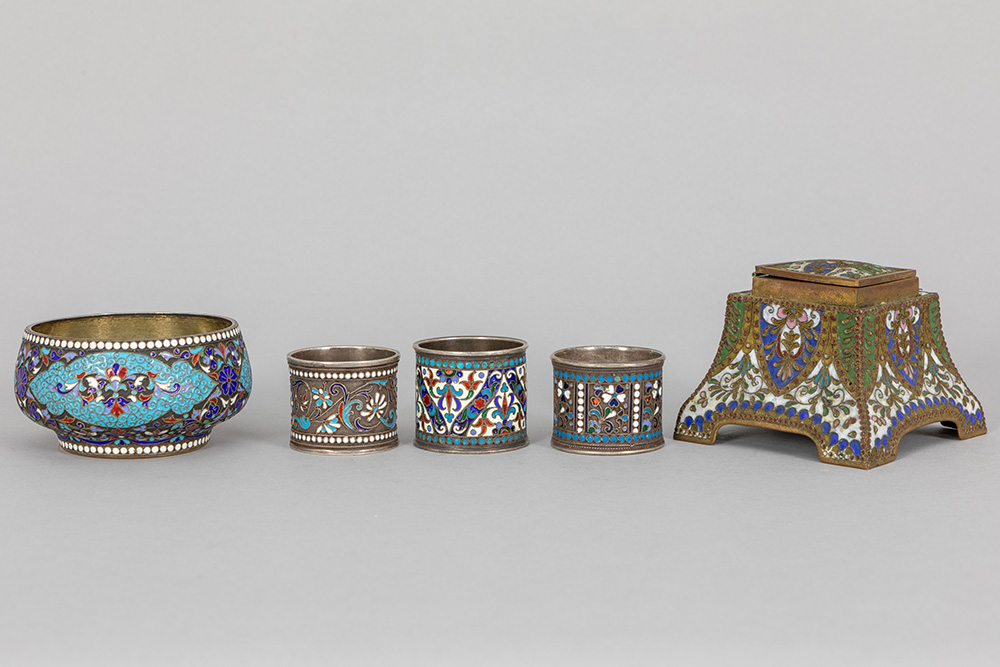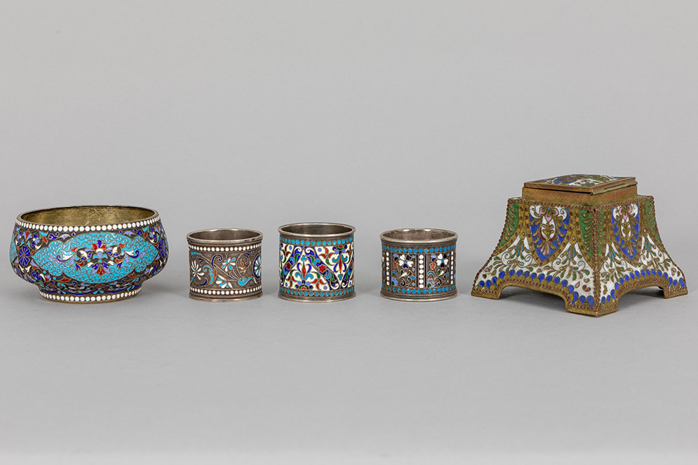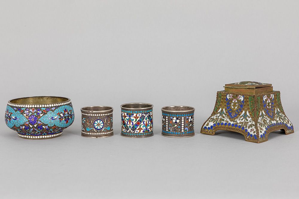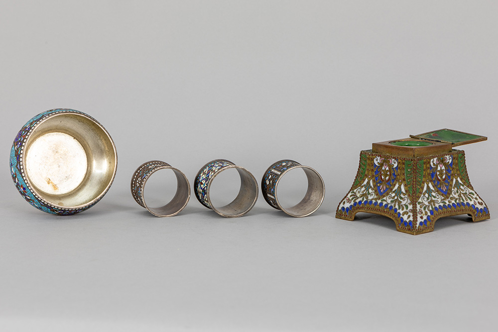 various lot of antique Russian silver with a kovsh, 3 napkin holders and an inkwel in enameled silver