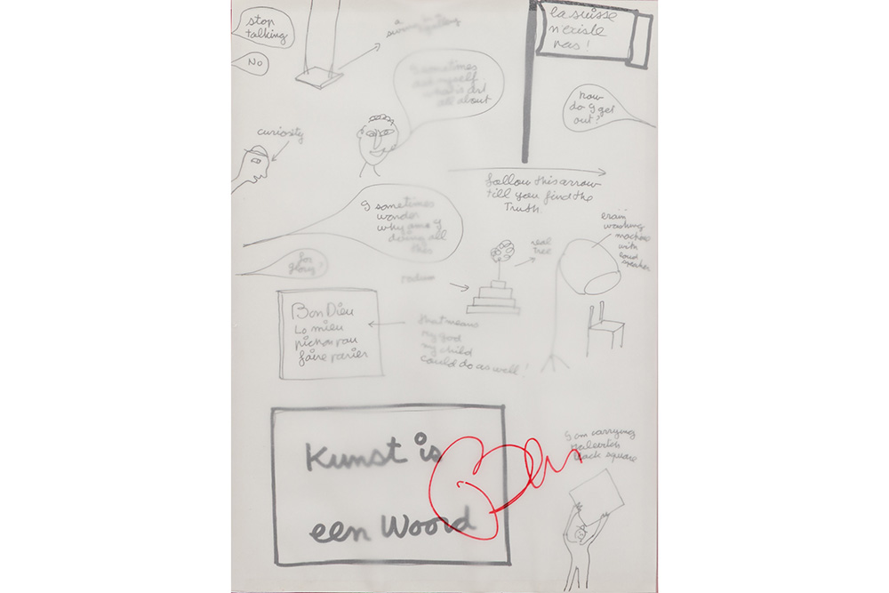 VAUTIER BEN (1935 – 2024) originele signatuur in rode pen op een kalkblad, bevestigd op een bladzijde uit het schetsboek “Kunst is een Woord” – 28 x 20