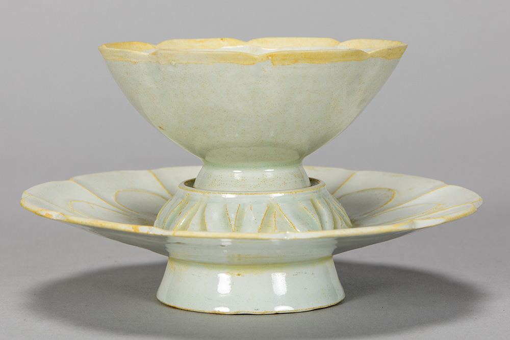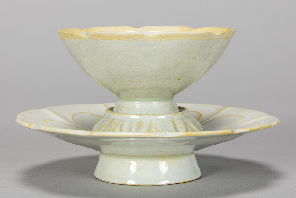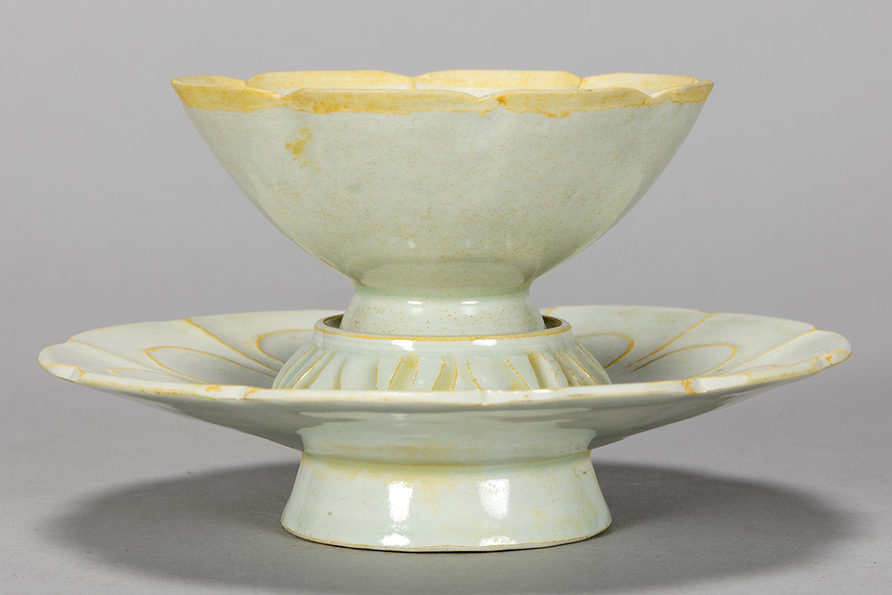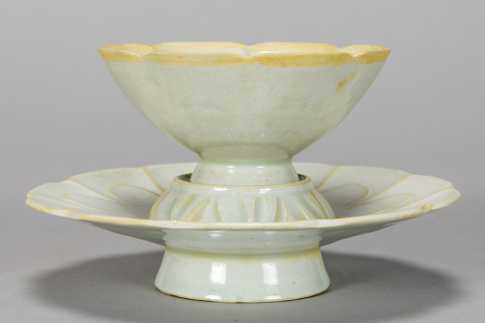Chinese tea set with cup and saucer, each on a base, in celadon glazed ceramic