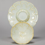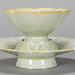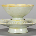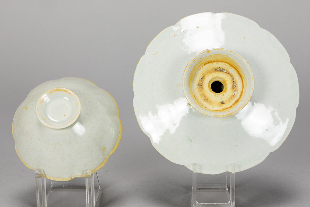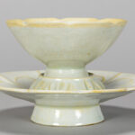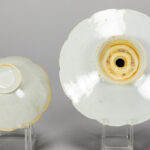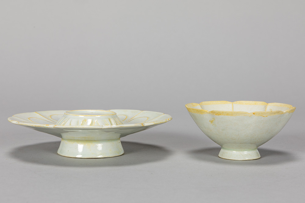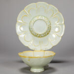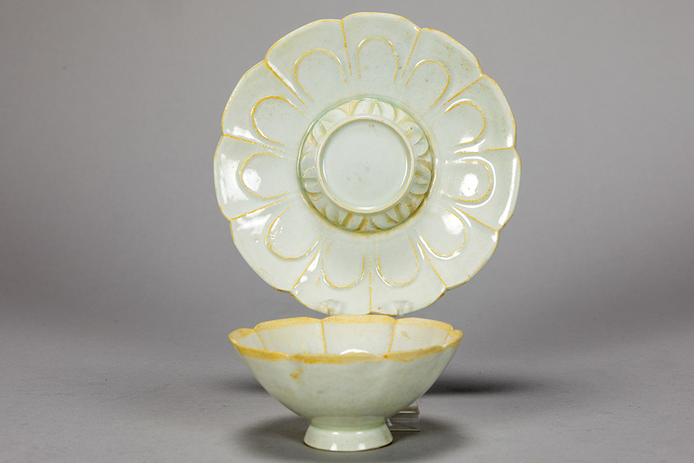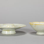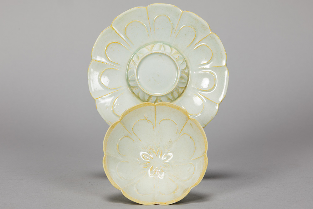 Chinese thee-set met tas en ondertas, beide op voet in faience met celadonglazuur – totale hoogte : 8,3 cm