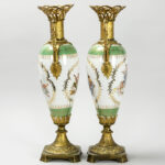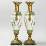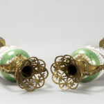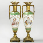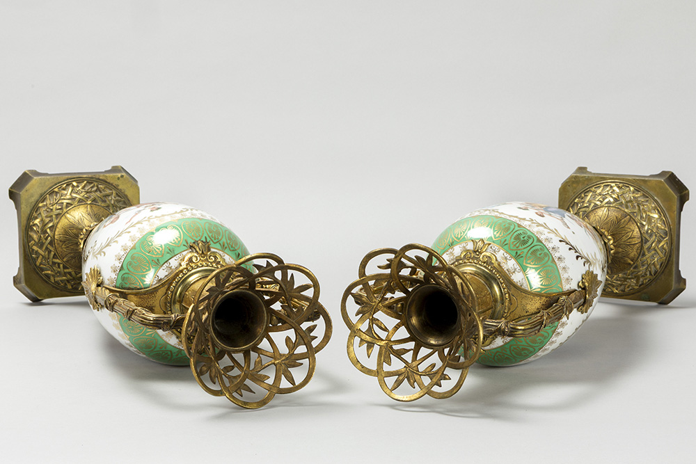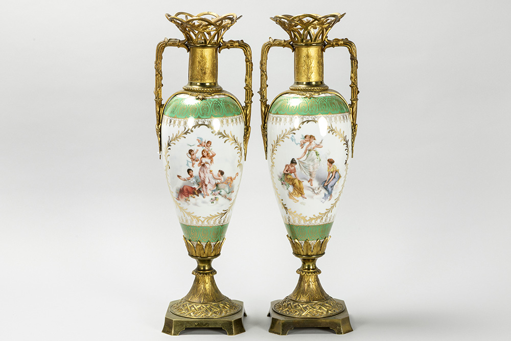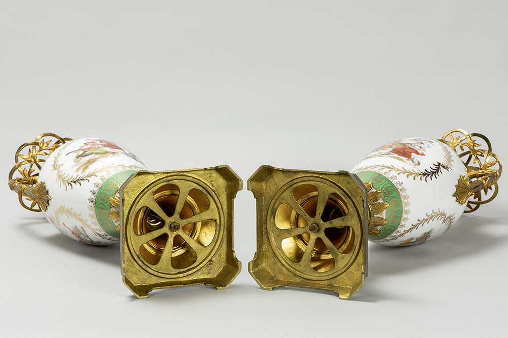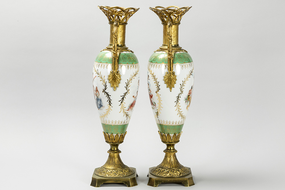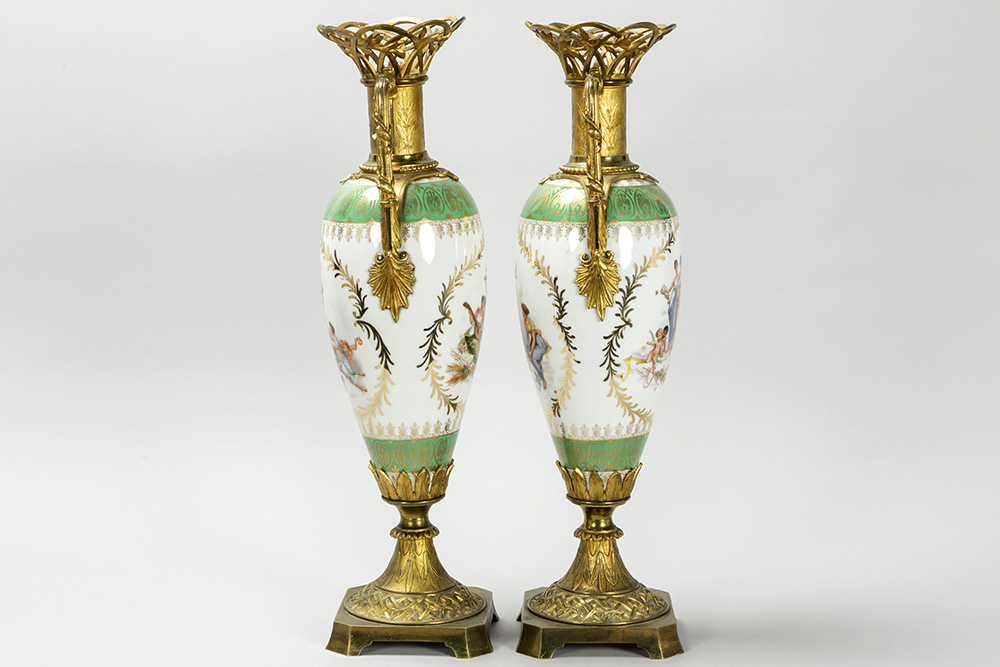 pair of 19th Cent. vases in finely painted Sèvres porcelain with female figures and cupids & with a mounting in gilded bronze