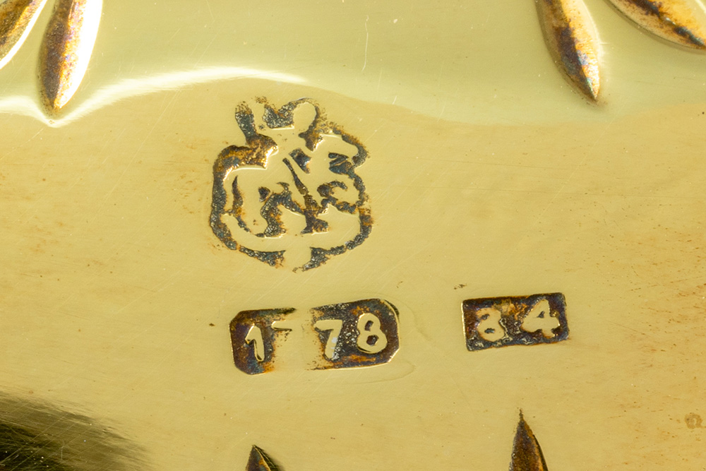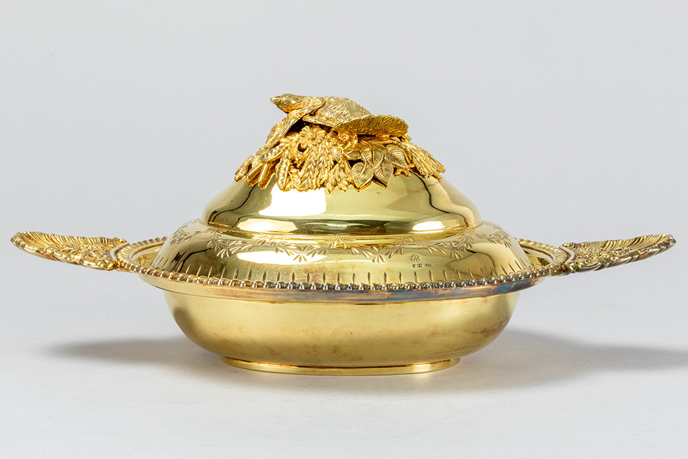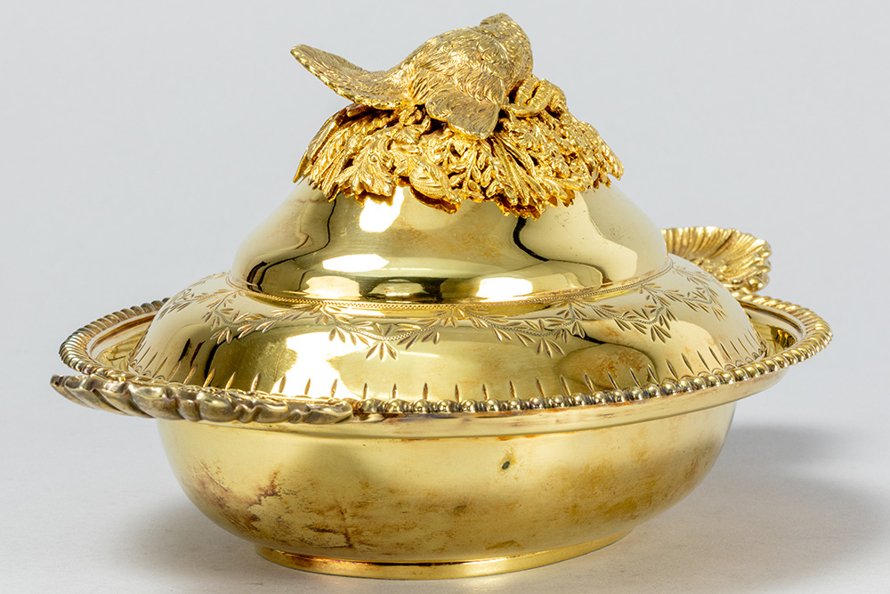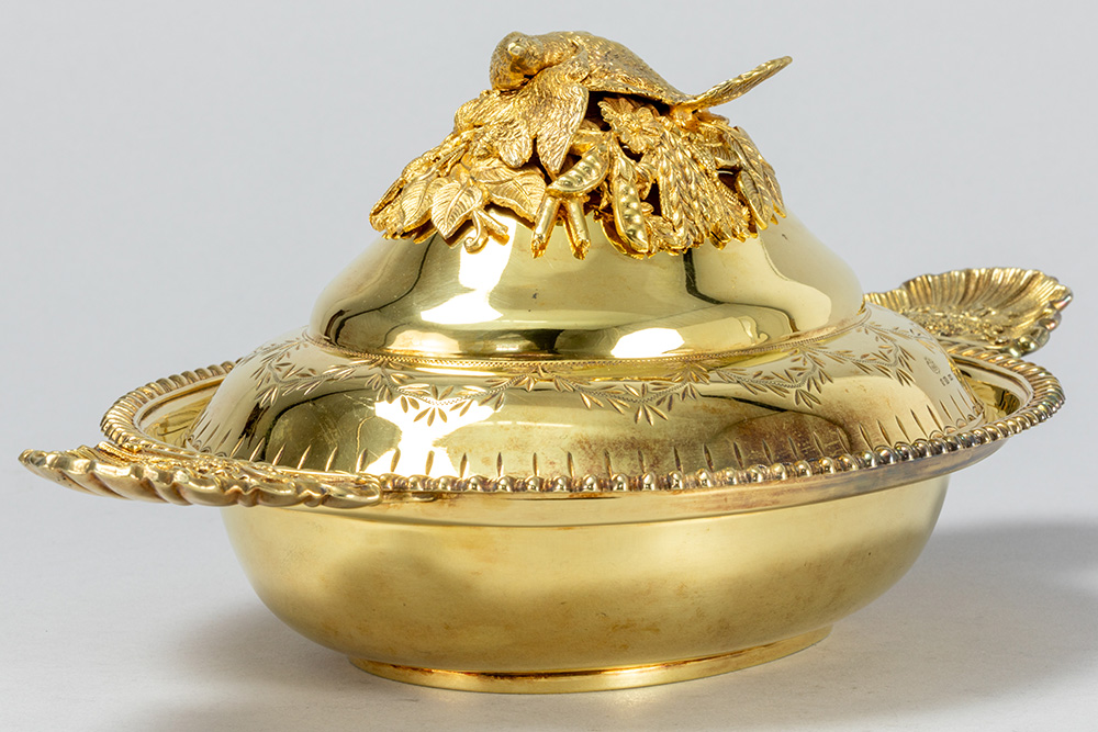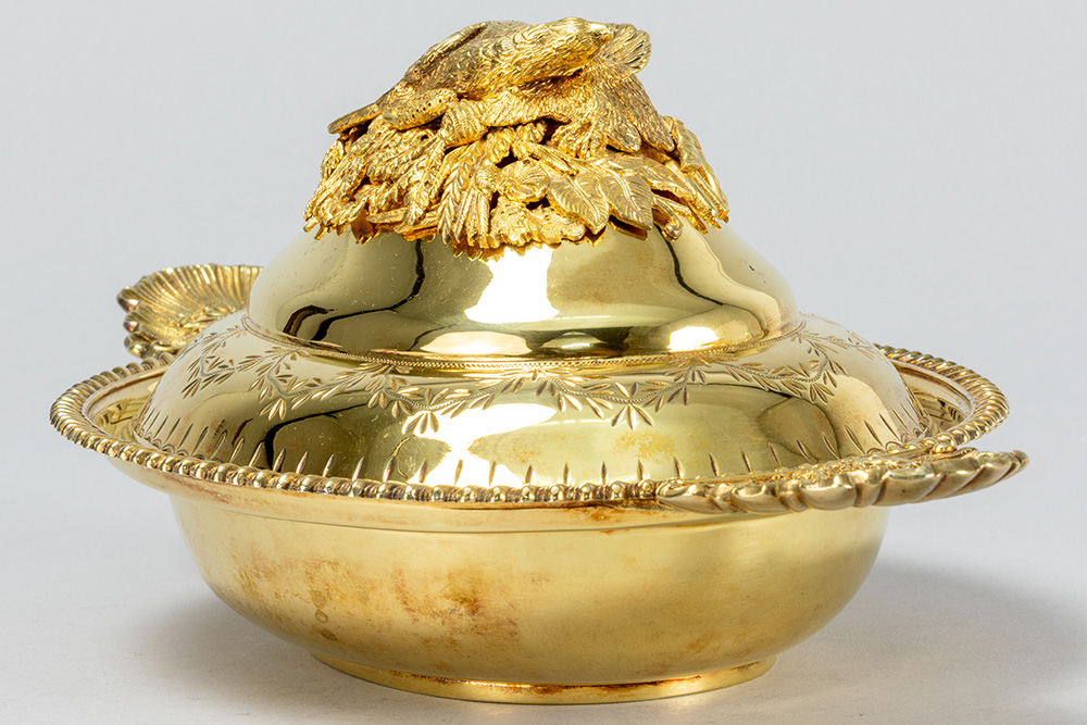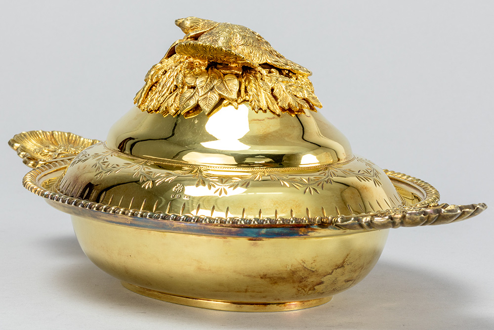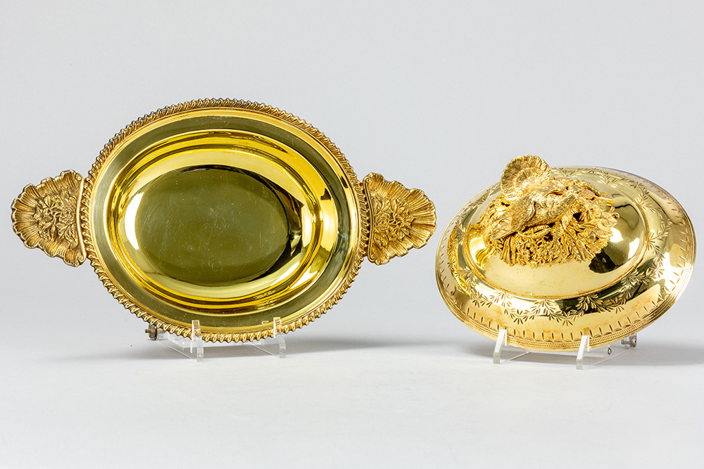 18th Cent. Russian lidded tureen in gilded silver, marked “84 zolotniks, Moscou 1778”