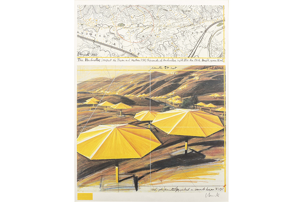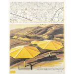 CHRISTO (1935 – 2020) offset print in kleuren met een beeld van het project “The Umbrellas – Japan – USA” dd 1984 – 1991 – met origineel stukje stof van de installatie – 80 x 60 getekend