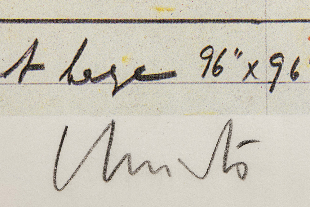 Christo signed offset print in colors from “The Umbrellas” project with an original piece of material used during this project