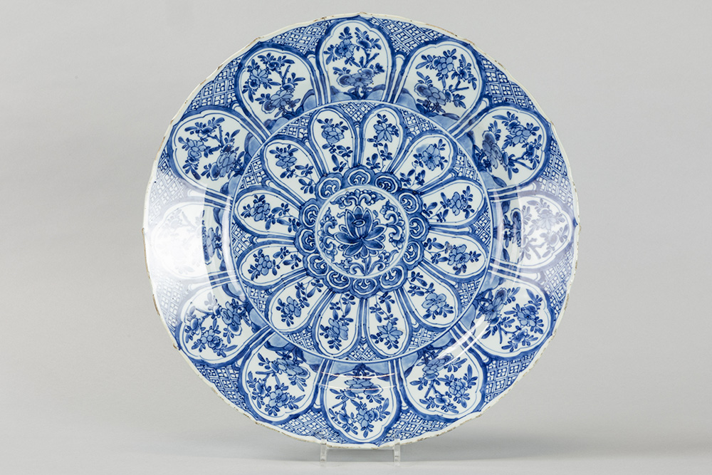 Achttiende eeuwse Chinese schaal in gemerkt (KangXi merk) porselein met blauwwit bloemendecor – diameter : 39 cm