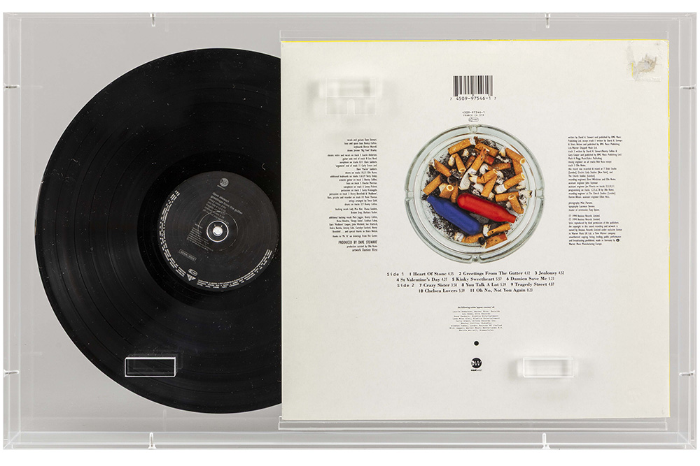Damien Hirst hand signed LP cover for the “Greetings from the Gutter” record by David Steward with its original vinyl – in plexi case