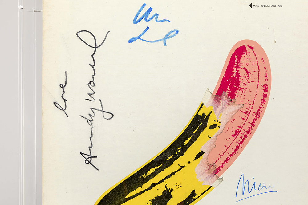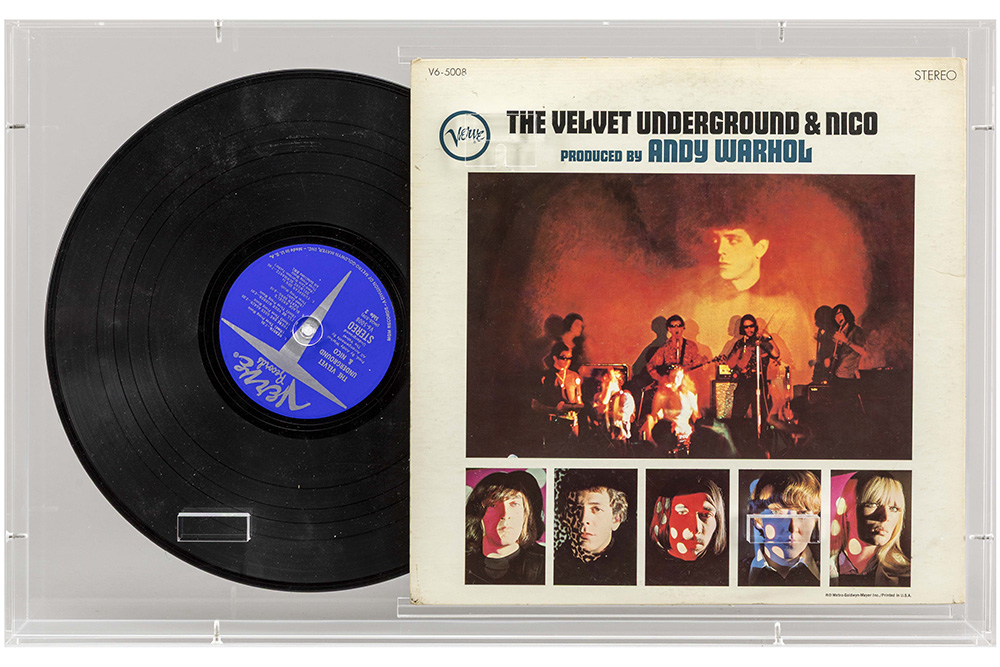 WARHOL ANDY (1928 – 1987) elpeecover met ontwerp van Warhol voor “The Velvet Underground & Nico” – met vinyl – in plexi-case (36 x 56) getekend door Warhol, Nico en Lou Reed ref : “Andy Warhol – Prints A catalogue raisonné 1962 – 1987” van Feldman en Schelman dd 2003 (S.349) prov : George Mulder Foundation