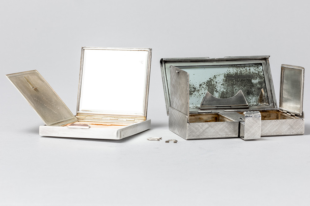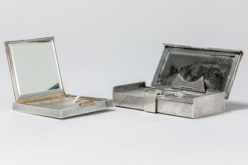 two silver powder cases, one with a gold clasp and one with a clasp with sapphires