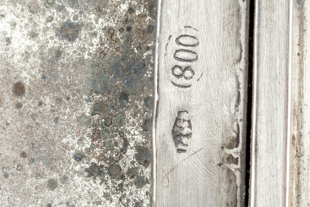 Lot (2) massief zilver met een Engelse poederdoos met gouden sluiting en een grotere zgn minaudière met sluiting bezet met saffiertjes