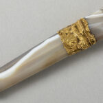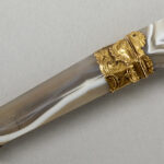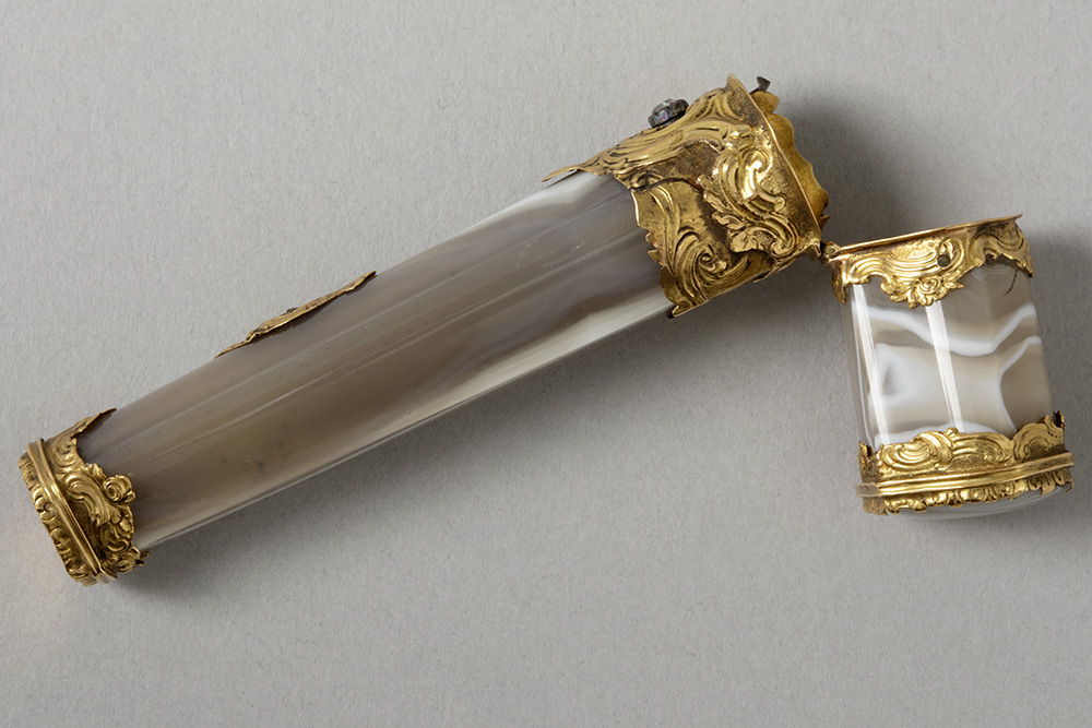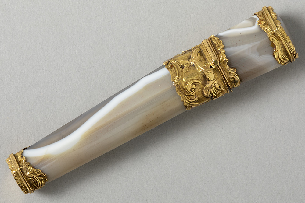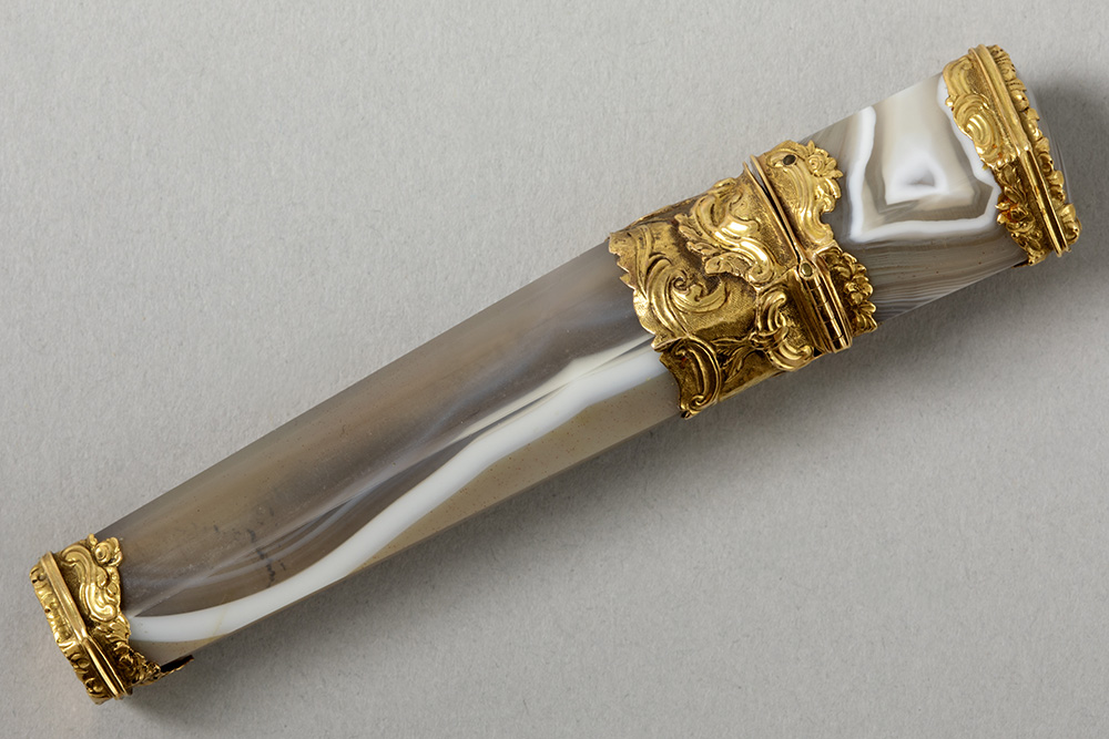 Zeldzame achttiende eeuwse Franse naaldenkoker in agaat met een Lodewijk XV- montuur in geelgoud (18 karaat) en met drukknop bezet met diamant – hoogte : 8,7 cm – gewicht : 21 gram – ca 1750/70