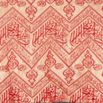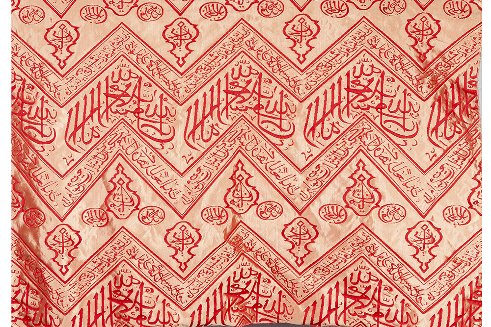 20th Century Turkish or Egyptian Ottoman silk inner kiswah curtain from the Kaaba, in cream-colored silk on a red ground. Comprising of lantern motifs, circular medallions and zigzag patterns forming a chain of stylized ‘7’ motifs. The central band repeats the ‘Kalimat al-Tawhid’, flanked by inscriptions of “Ya Mannan” and “Ya Hannan” within the lantern motifs, “Paise be to Allah” in the medallions and in the upper and lower bands Quranic verses from ‘Surah al-Baqarah’ (2:144) and ‘Surah al-Imran’ (3:96)