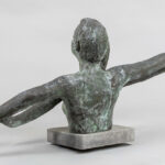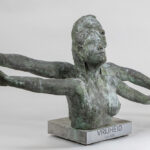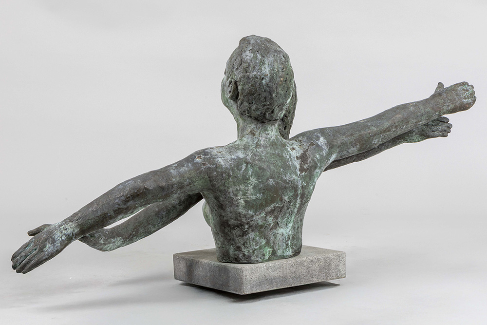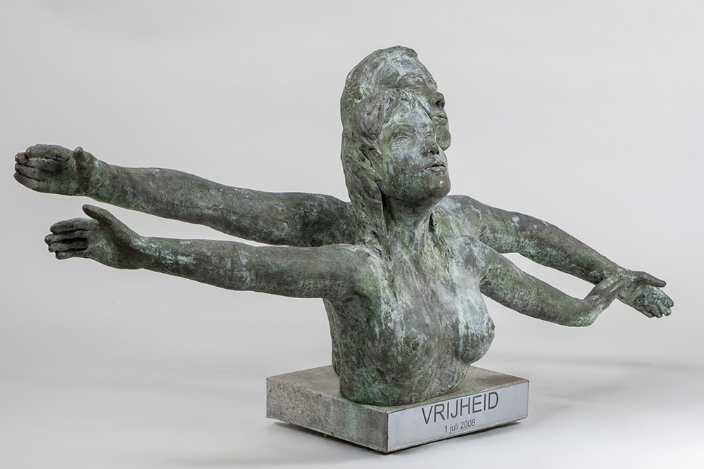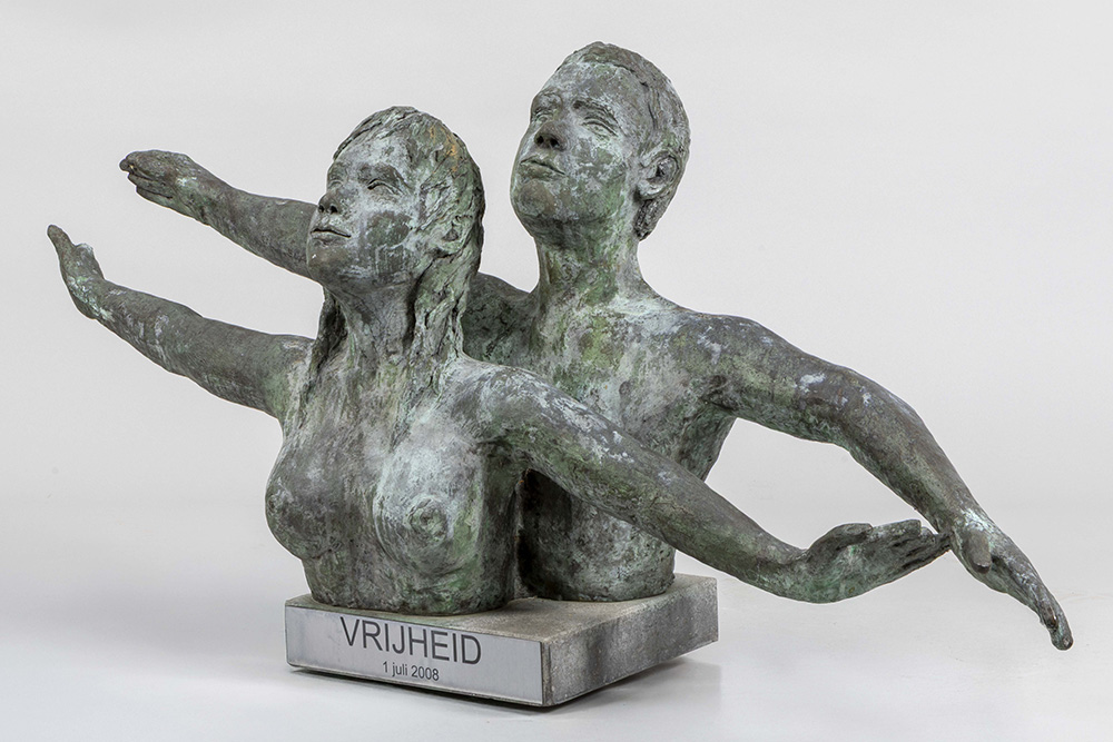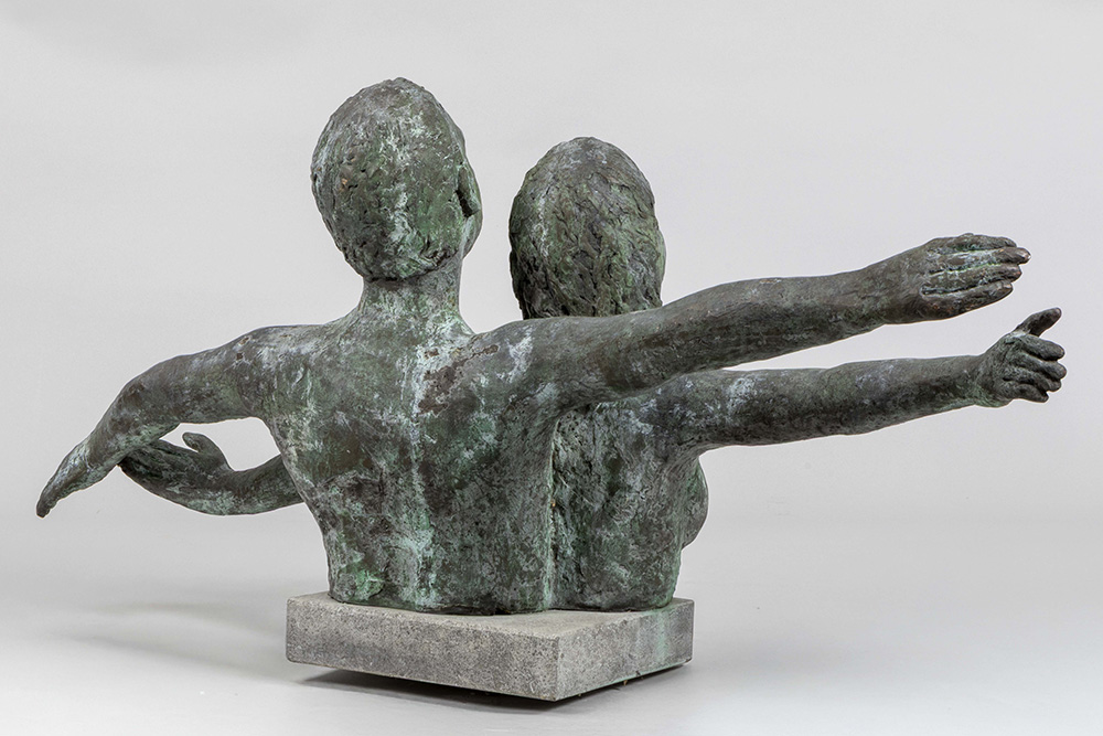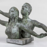 Dubbelsculptuur in brons met mans- en vrouwenbuste, telkens met gespreide armen, getiteld “Vrijheid” – hoogte en breedte : 50 x 125 cm met bronsstempel