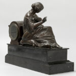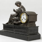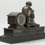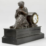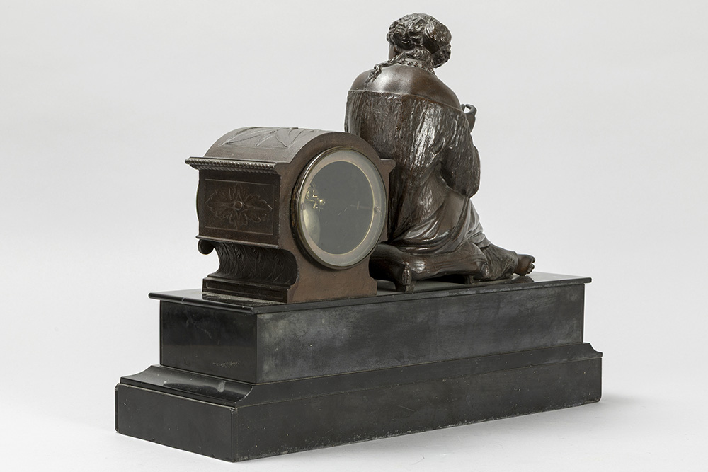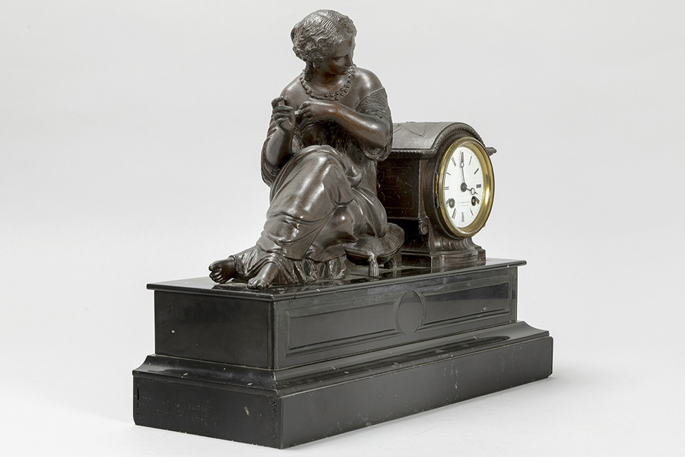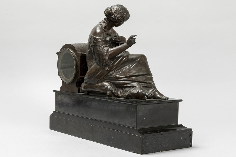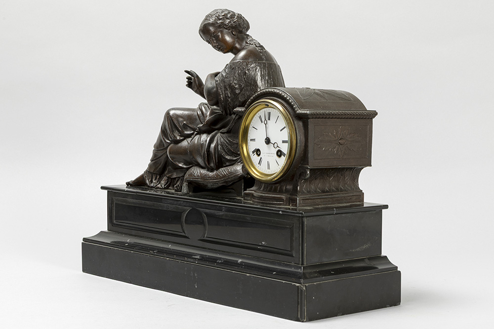 Antieke klok in zwarte marmer met een zittende dame in bronsgepatineerd metaal en met werk getekend “Japy frêres” – breedte : 43 cm