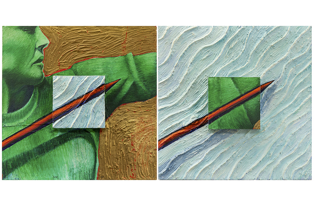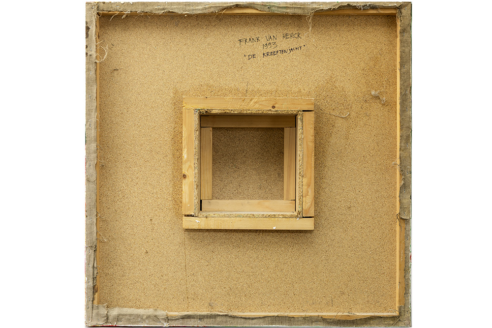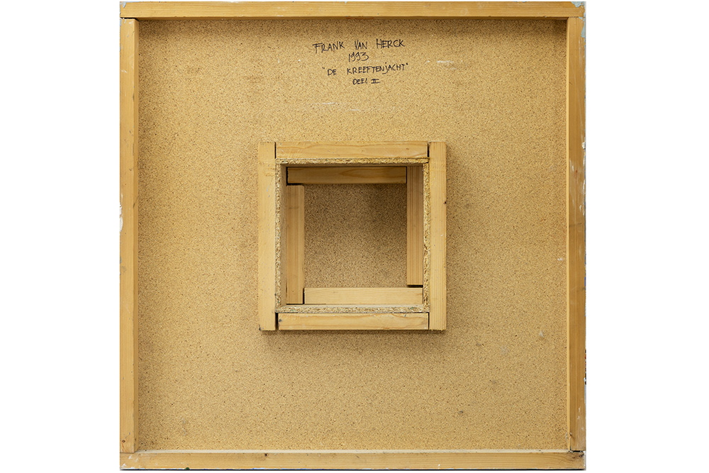VAN HERCK FRANK (XX – XXI) pendant olieverfschilderijen op paneel / wandsculpturen getiteld : “De Kreeftenjacht” – 75 x 75 telkens getekend en gedateerd 1993 op de verso