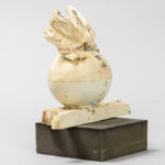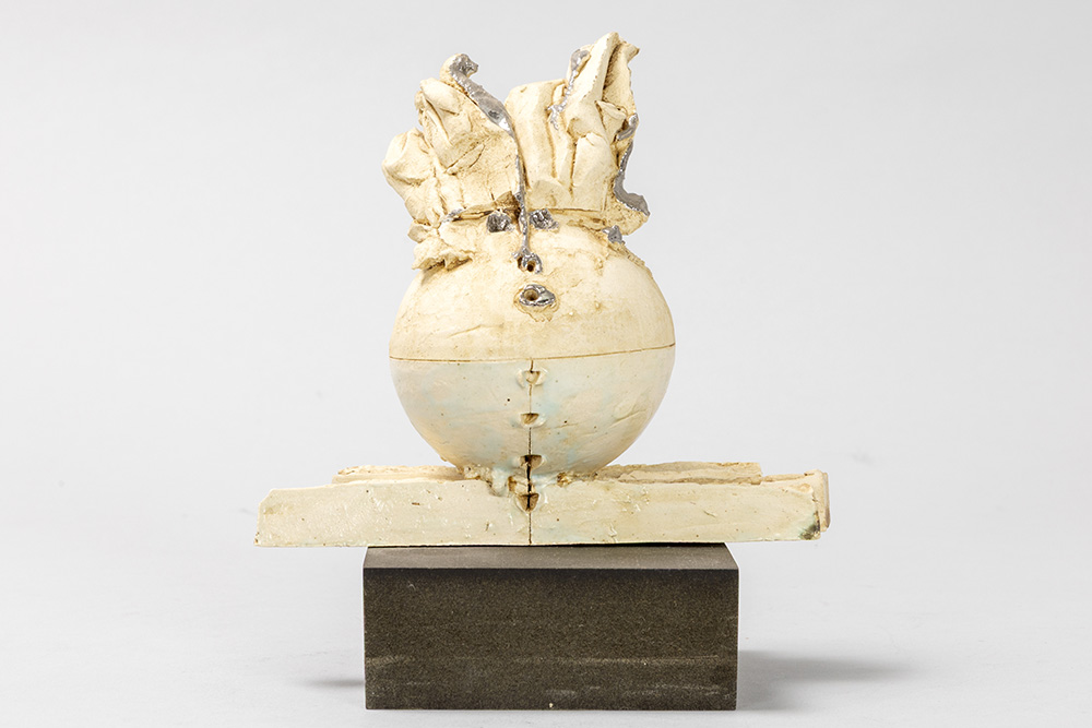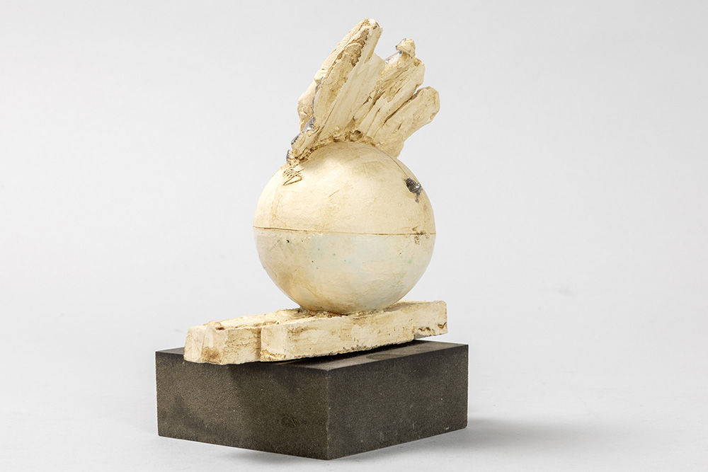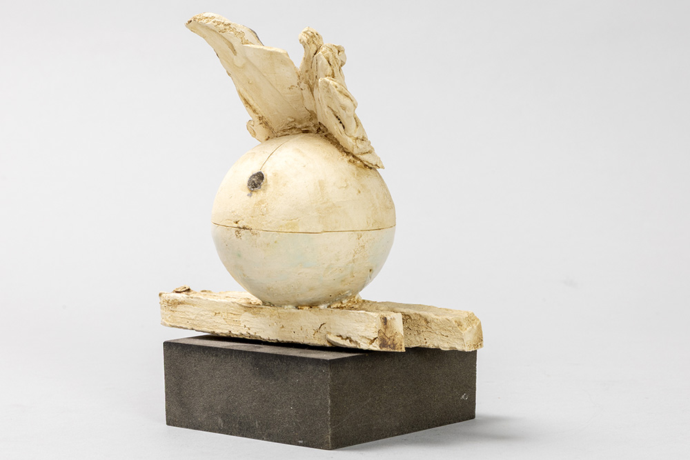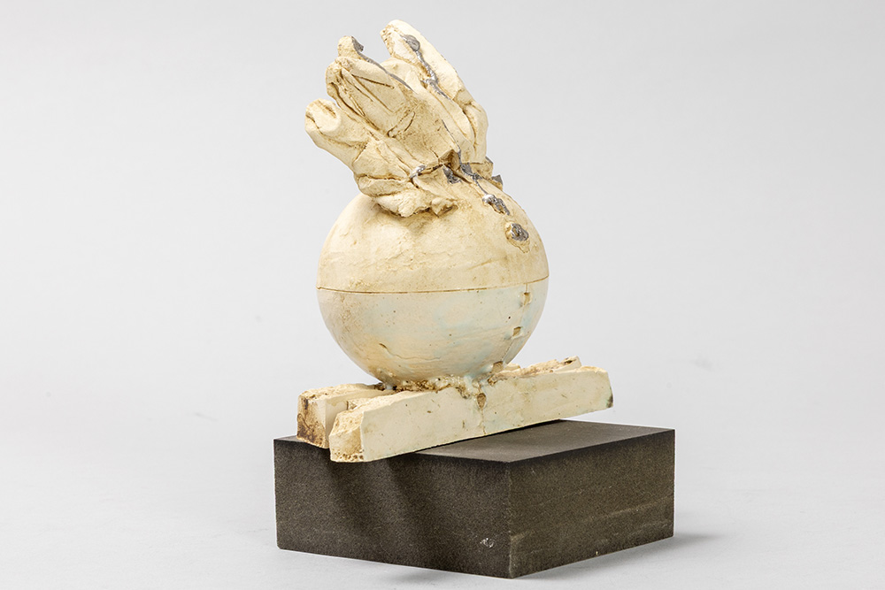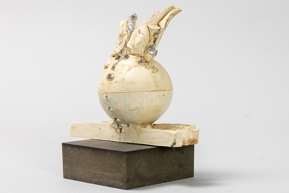 Onleesbaar getekende, 20ste eeuwse sculptuur in deels beschilderde keramiek op een geëboniseerde sokkel – hoogte : 14,5 cm