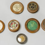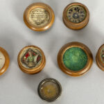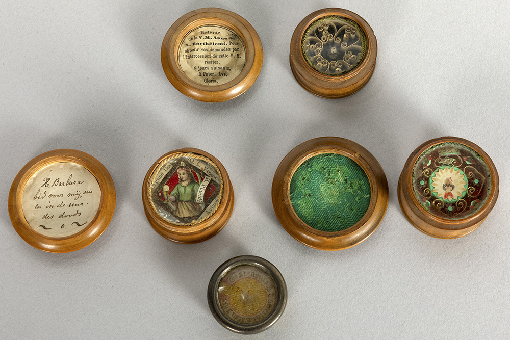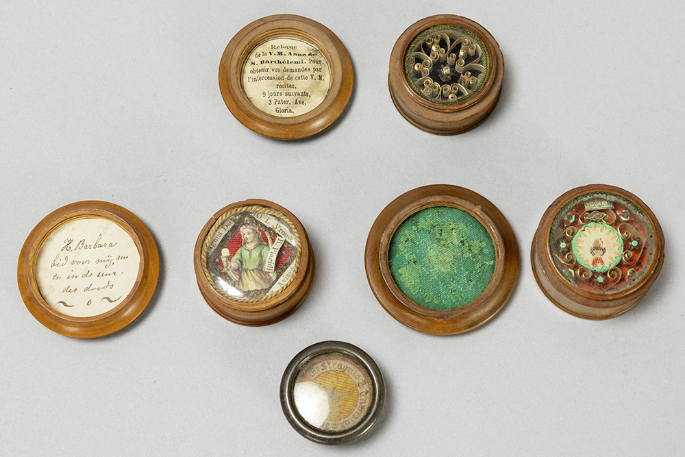 Lot (6) met vijf relikwiehouders, waaronder vier theca’s, en een bas-reliëf