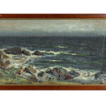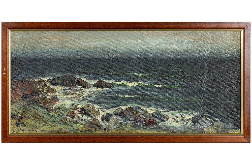MILNE JOHN MACLAUCHLAN (1885 – 1957) (UK – Schotland) schilderij in gemengde techniek met olie en scherven, …op doek : “Rotsen in de branding” – 21,5 x 48,5 getekend