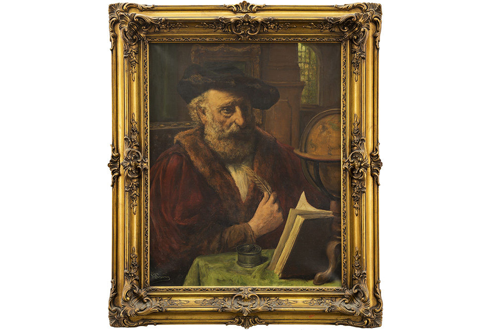 BRUNIN LEON (1861 – 1949) olieverfschilderij op doek : “Geleerde met boek en wereldbol” – 75 x 60 getekend