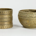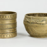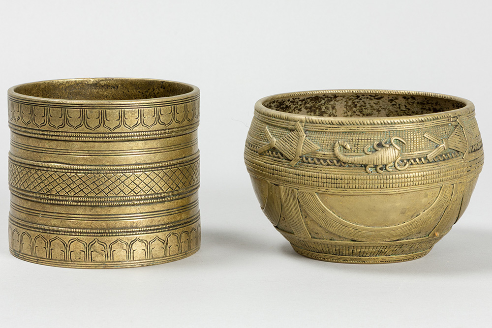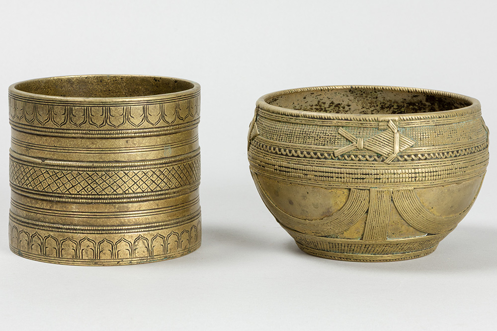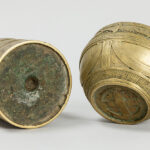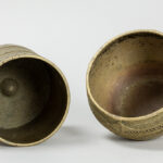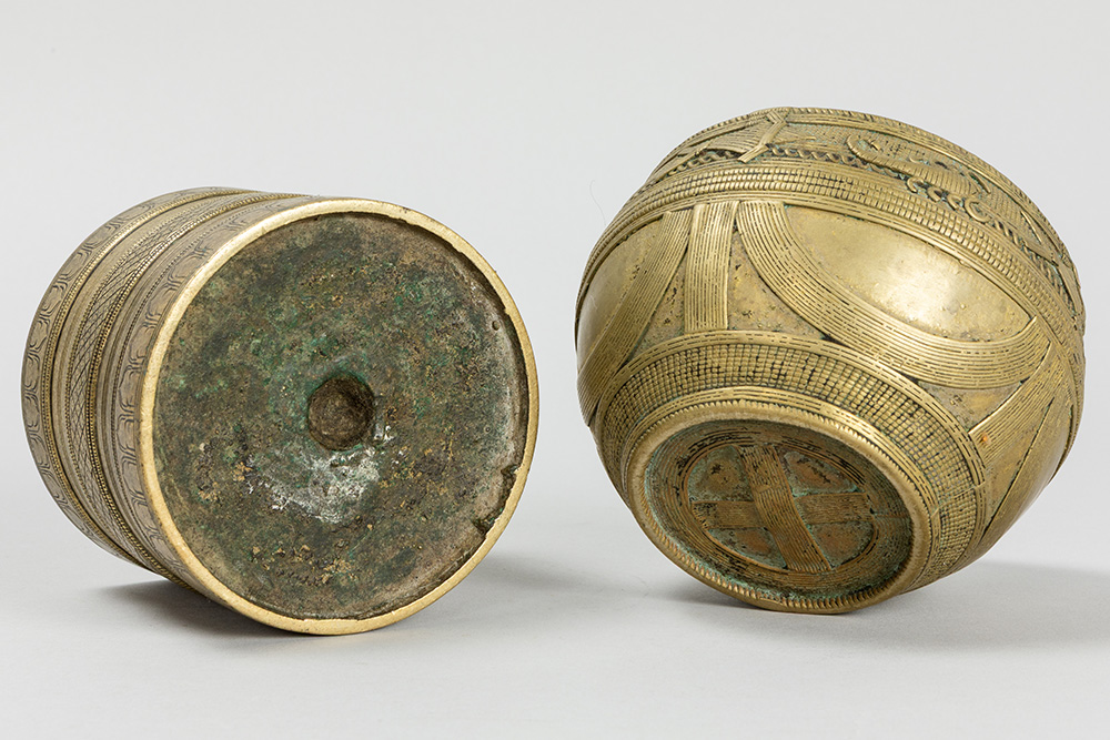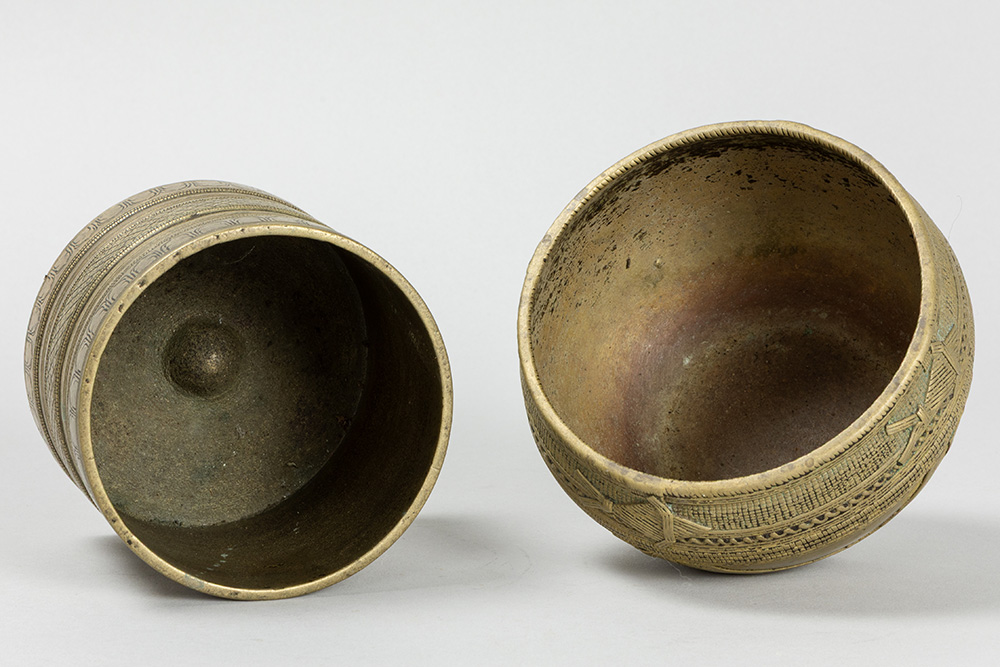 Lot van twee Indische potten in brons – hoogtes : ca 9 cm