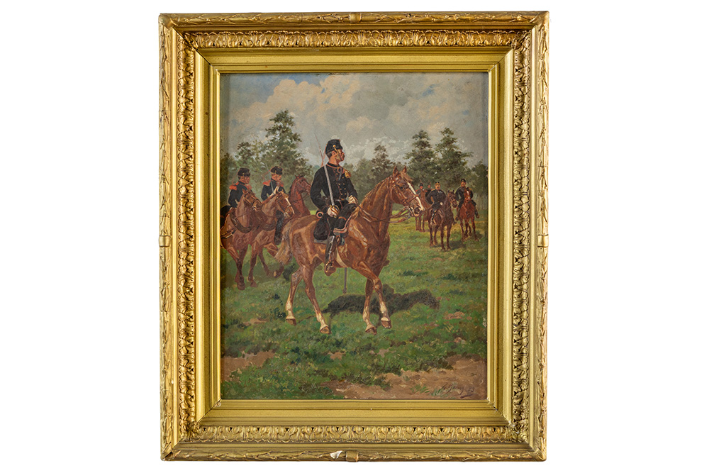GEENS LOUIS (1835 – 1906) olieverfschilderij op paneel : “Soldaten te paard” – 46 x 37,5 getekend en gedateerd (18)83