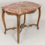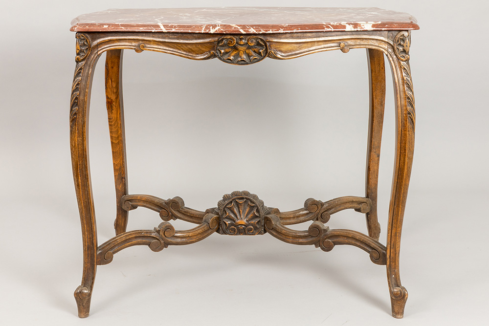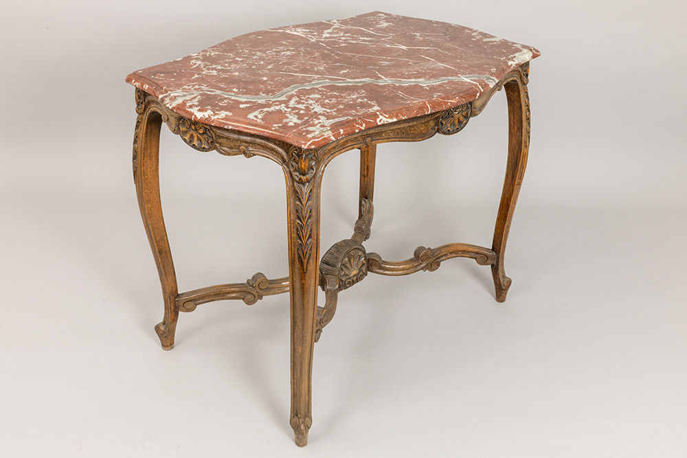 Kleine antieke tafel in eik met marmeren blad – 70 x 88 x 63 cm