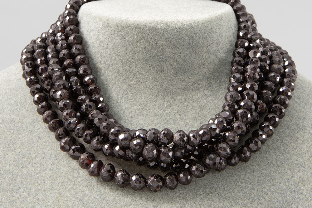 antique necklace with five rows of faceted garnet beads and a lock in yellow gold (14 carat) with small garnets