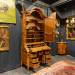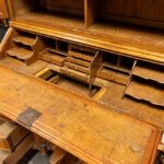 Prachtig achttiende eeuws zgn “topbureau” in kerselaar met onderaan een “kneehole”-bureau met zeven laden, deurtje en neervallend werkblad (met mooi interieur met leesplank) en met bovenaan twee deuren (met erachter de originele étagères) en een gegalbeerde kop met centrale rocaille – 268 x 125 x 63 cm